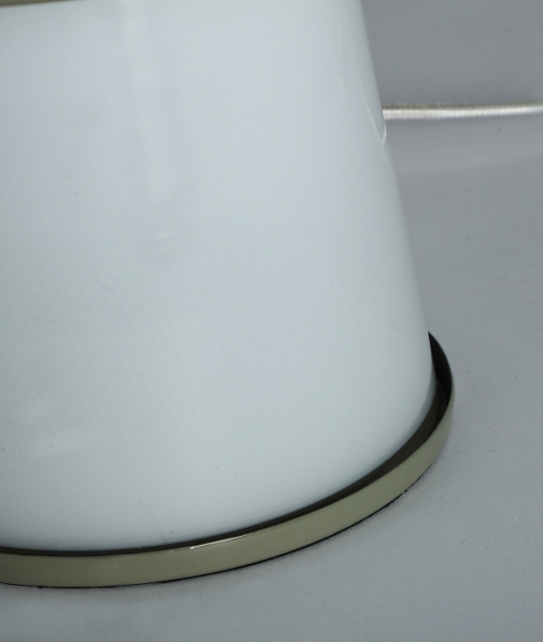 CORTONA este o lampă de masă cu design geometric și rafinat, ce îmbină sticla albă cu fierul vopsit verde într-o compoziție modernă și elegantă. Forma sa inspirată de ciupercă, cu abajur rotunjit și bază conică, creează un echilibru vizual plăcut și o lumină difuză, perfectă pentru spații contemporane.