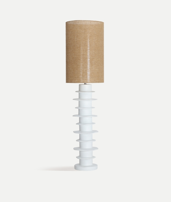 Lampa FAROA aduce un echilibru perfect între forma modernă și căldura materialelor naturale. Baza din ceramică albă mată are o siluetă grafică, cu accente verticale inspirate din arhitectura contemporană, în timp ce abajurul din rafie difuzează o lumină caldă și plăcută. Rezultatul este o piesă decorativă ideală pentru spații care caută armonie, confort și eleganță discretă.