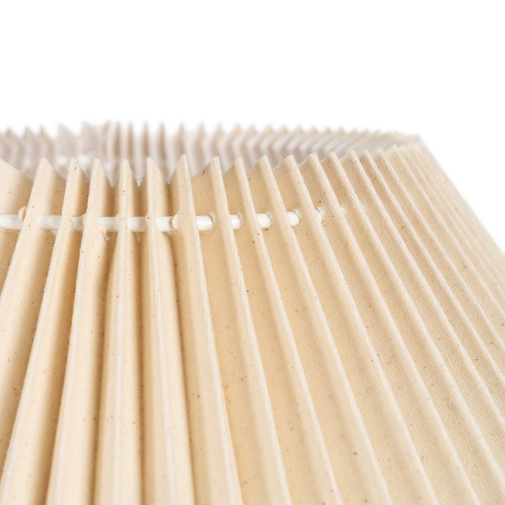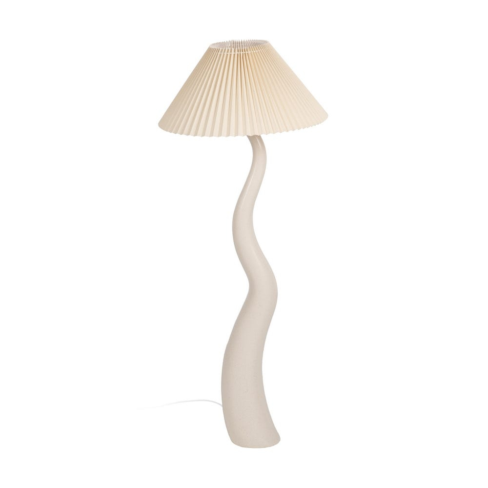 Forma ondulată a bazei ceramice transformă acest lampadar într-un obiect de design sculptural, care adaugă volum și dinamism decorului. Nuanța caldă de bej creează o lumină difuză și plăcută, potrivită pentru zonele de relaxare, iar abajurul plisat completează estetica atemporală cu un detaliu textil elegant.