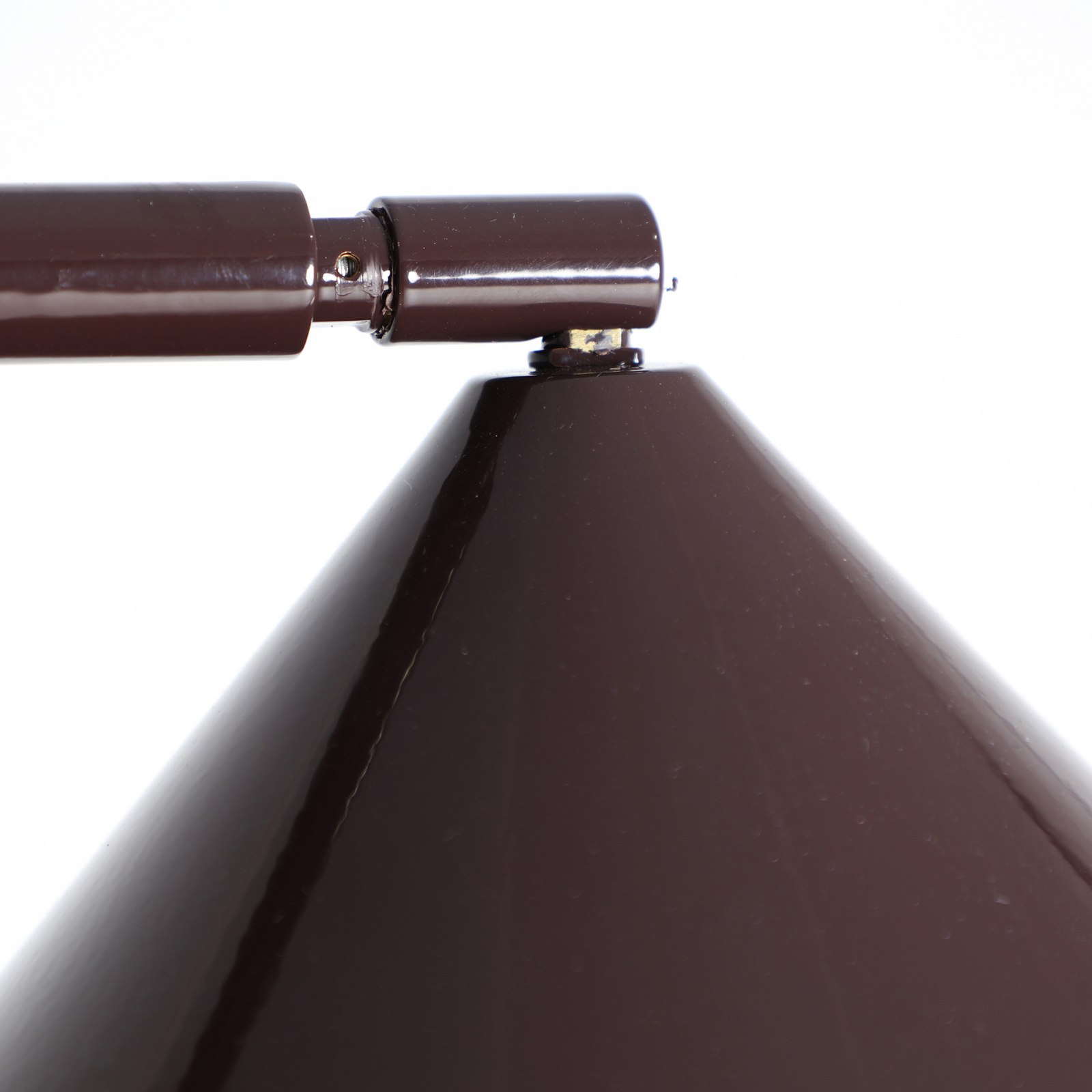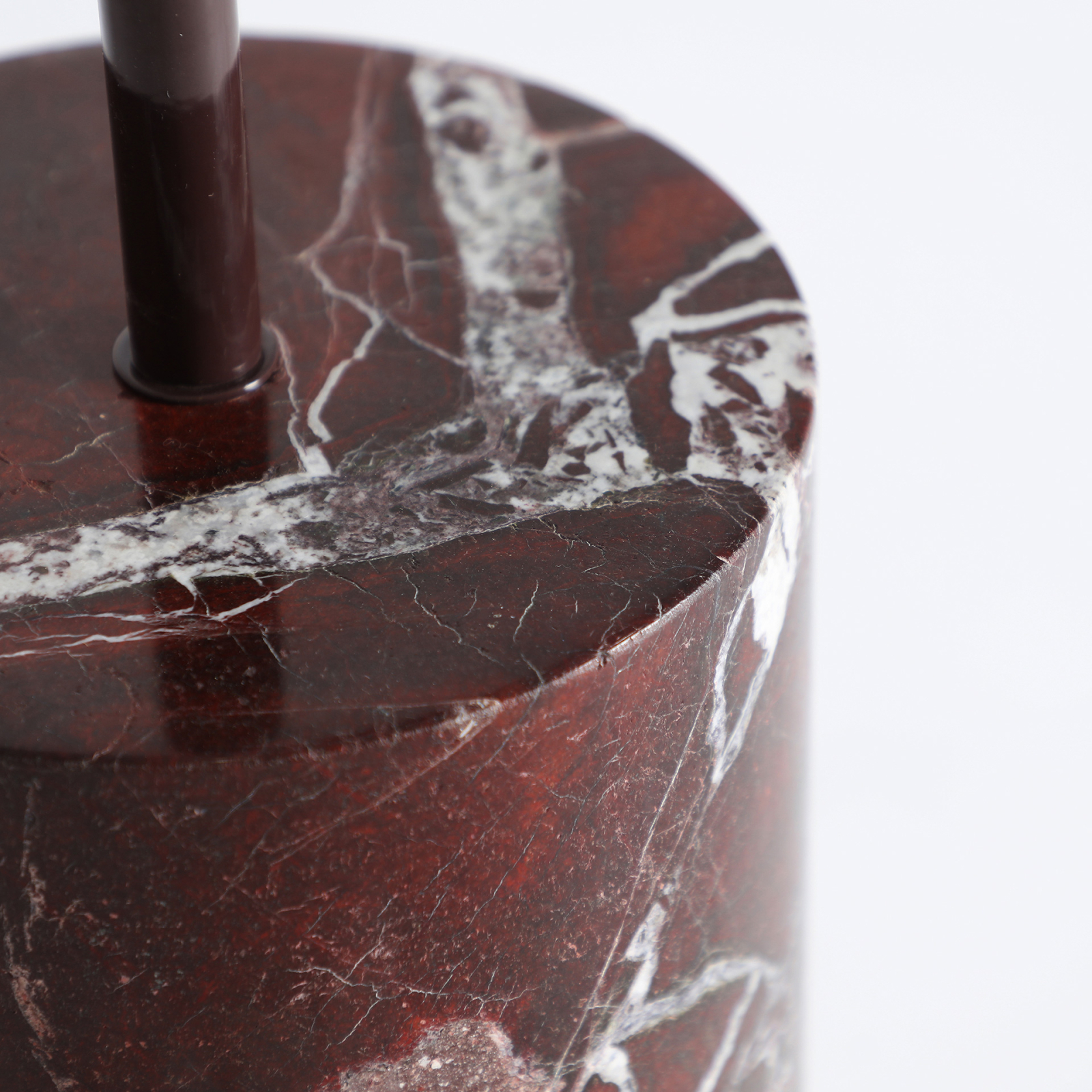 Baza cilindrică din marmură sintetică cu finisaj venat ancorează vizual piesa și îi conferă stabilitate, în timp ce tija metalică subțire trasează o linie elegantă până la abajurul conic. Finisajele în tonuri închise creează un contrast subtil între suprafețe, punând accent pe formă și proporție.
