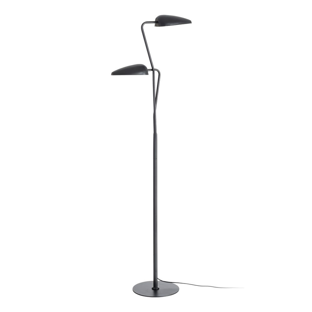 Lampadar din metal negru cu două brațe asimetrice pentru iluminat decorativ și zone de lectură, cu profil suplu și estetică modernă. Silueta verticală pornește dintr-o bază rotundă subțire și se ramifică în două capete metalice cu volum geometric discret, ideale pentru a crea puncte de lumină direcționate în living, dormitor sau home office.