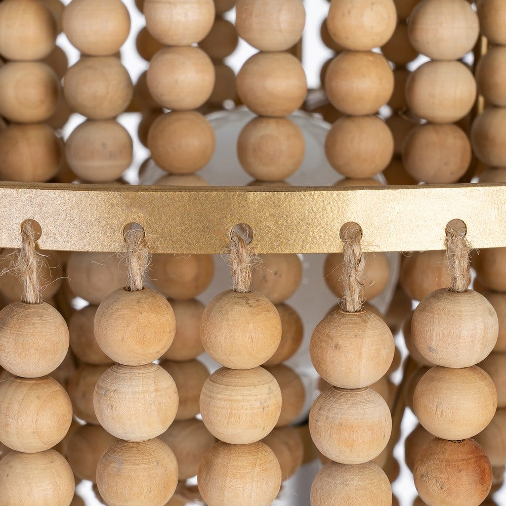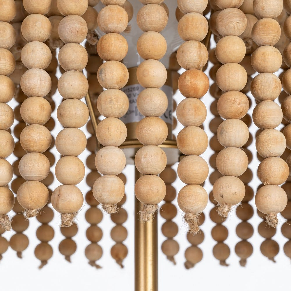 Acest lampadar natural-auriu aduce un farmec unic în orice interior, fiind caracterizat de un abajur spectaculos realizat din șiruri de mărgele din lemn, care difuzează lumina într-un mod cald și plăcut. Baza metalică aurie oferă stabilitate și eleganță, transformând lampa într-un element de decor de sine stătător. Este ideal pentru living, dormitor sau un colț de relaxare, unde atmosfera contează la fel de mult ca funcționalitatea.