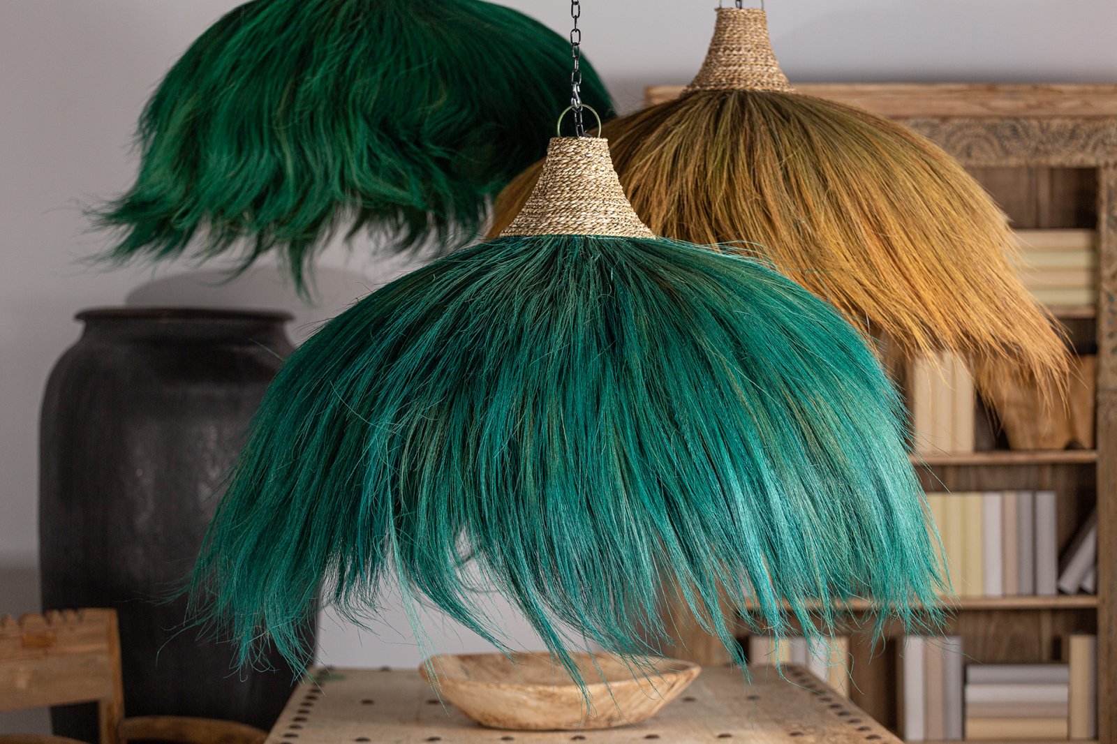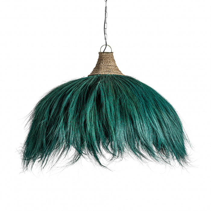 Lustră etnică din fibră naturală turcoaz, creată manual. Piesă statement cu aspect organic pentru o atmosferă vibrantă. Lustră colorată pentru un decor exotic și îndrăzneț.