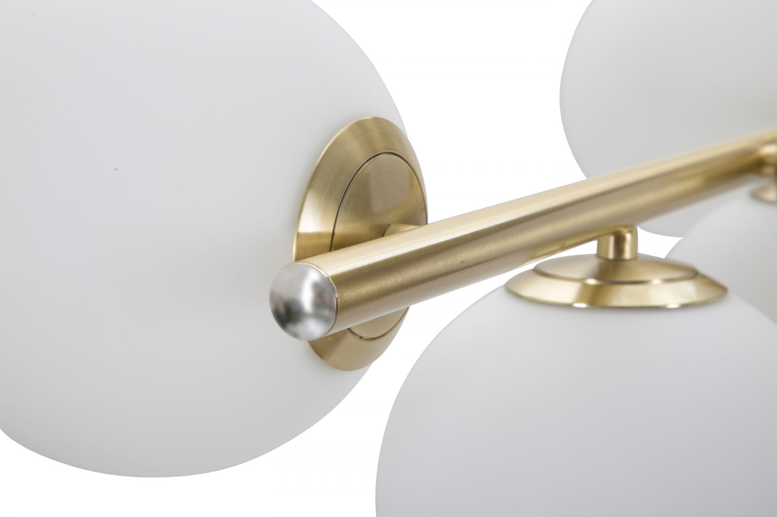 Lustra din metal auriu cu 7 sfere/globuri din sticla alba.