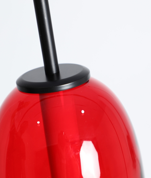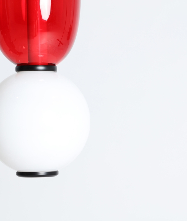 Lampa LARISA combină un glob alb din cristal cu un element roșu alungit, formând o compoziție sculpturală cu un contrast cromatic intens. Finisajele netede și lucioase amplifică jocul luminii, iar detaliile subtile negre conferă profunzime și un aspect modern, elegant.