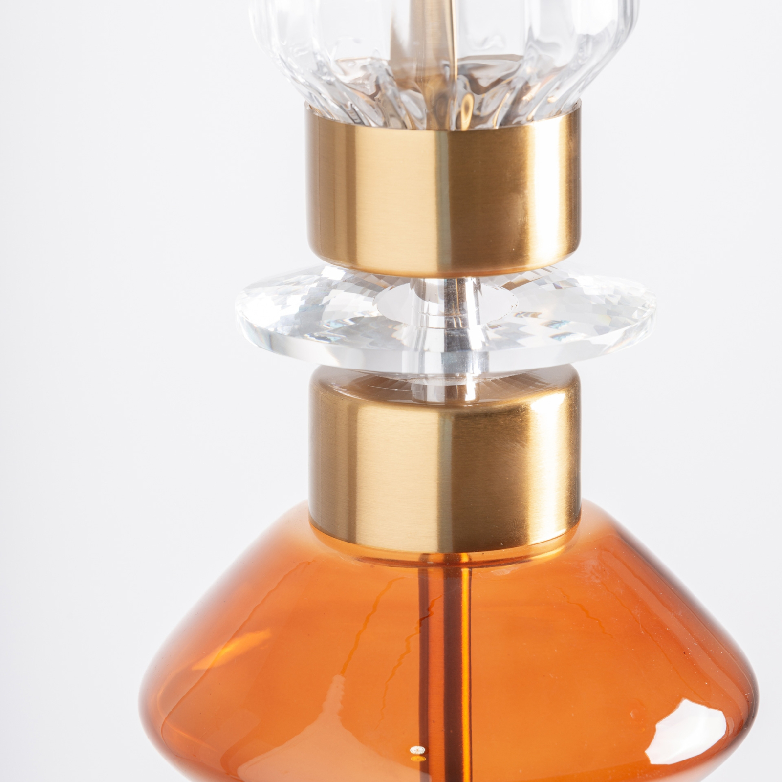 Cristalul fumuriu filtrează lumina într-un mod plăcut și cald, iar alternanța dintre suprafețele transparente și accentele metalice creează profunzime și ritm vizual. Finisajul cupru adaugă un plus de caracter și eleganță, fără a încărca compoziția.