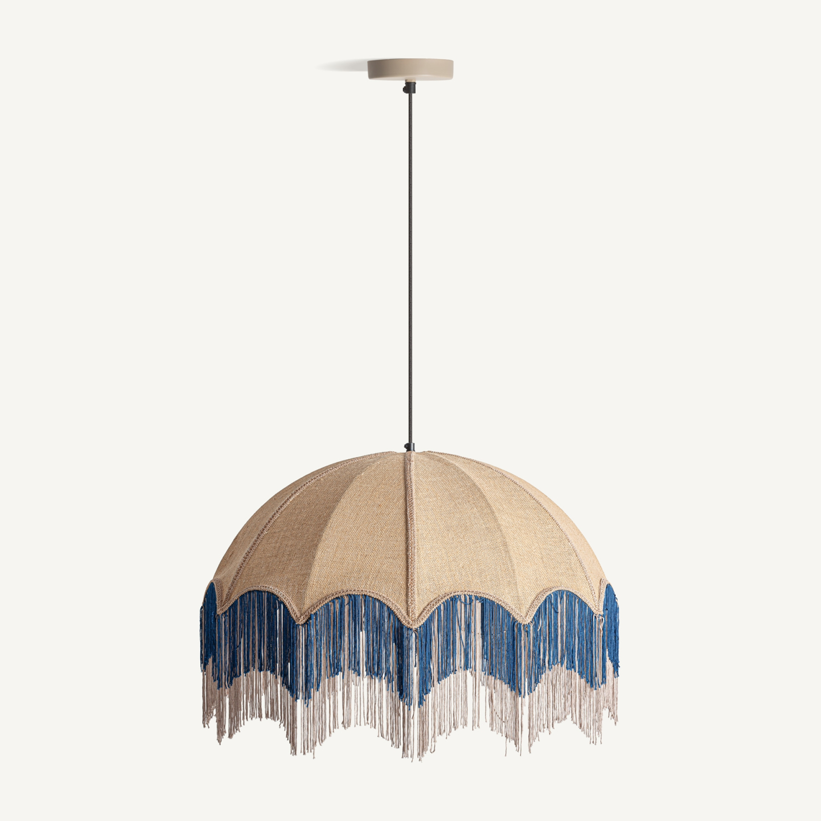 Forma de umbrela creeaza o prezenta vizuala clara deasupra unei mese, iar franjurii adauga miscare si un contur decorativ care schimba atmosfera in functie de lumina. Tonul natural al iutei pastreaza un aer relaxat, in timp ce albastrul franjurilor introduce o nota de culoare bine definita.