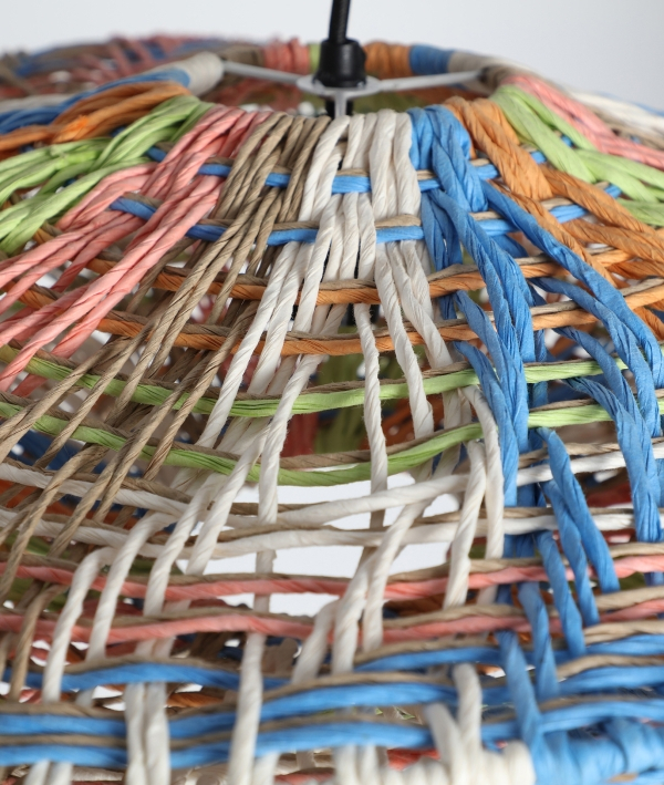 Modelul KALEI impresionează prin structura sa împletită manual, realizată din rafie colorată în nuanțe vii de albastru, verde, roz, portocaliu și crem. Formele fluide și textura naturală transformă lampa într-un element decorativ cu un puternic impact vizual, perfect pentru a aduce dinamism și căldură într-un spațiu.