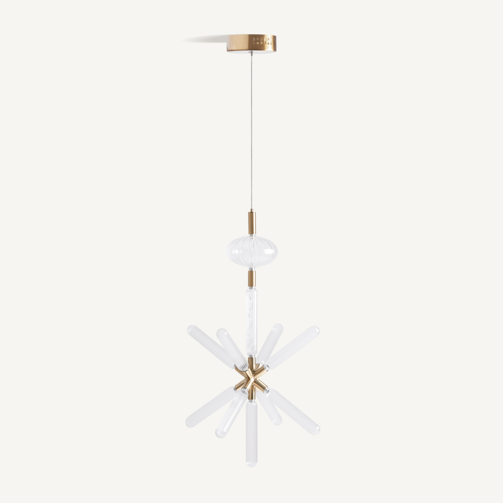 Această lampă suspendată impresionează printr-o compoziție dinamică, cu elemente radiale din cristal transparent dispuse în jurul unui nucleu metalic cu finisaj bronz. Designul său aerisit creează un efect vizual spectaculos, păstrând în același timp o eleganță echilibrată și contemporană.
