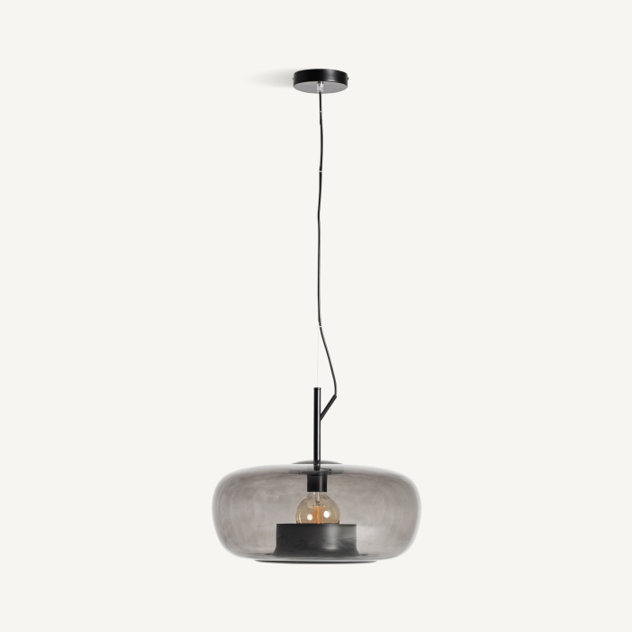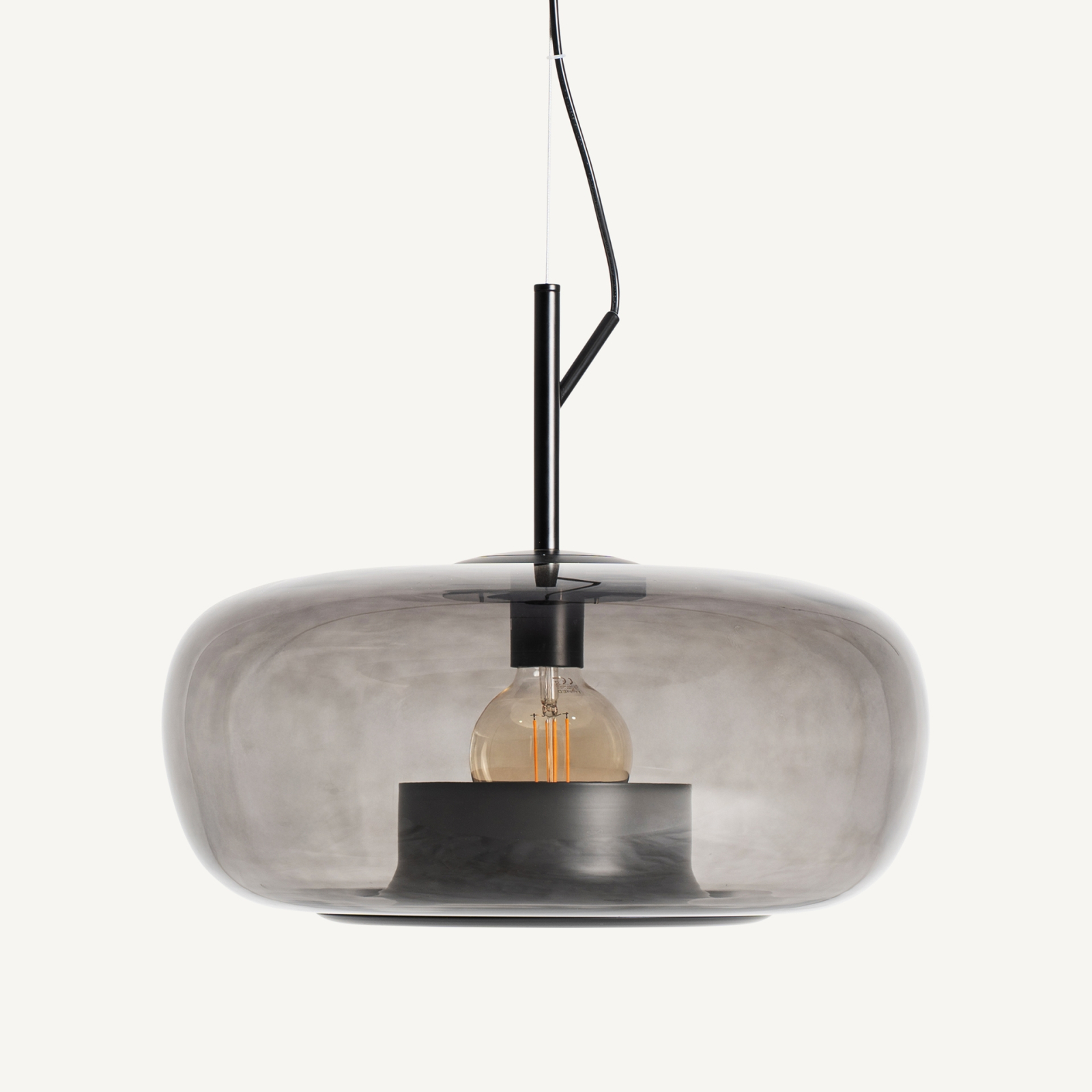 Abajurul este realizat din sticlă în culoare gri cu finisaj translucid, având o formă rotunjită, aplatizată, care învăluie sursa de lumină. Detaliile din metal negru susțin structura și accentuează liniile curate ale piesei, oferind un contrast vizual echilibrat.