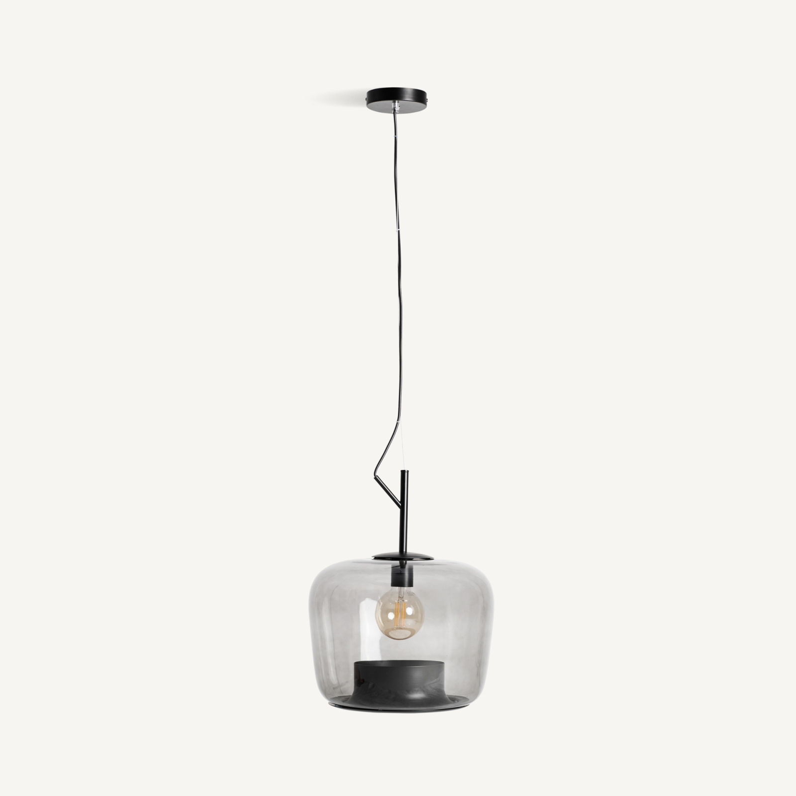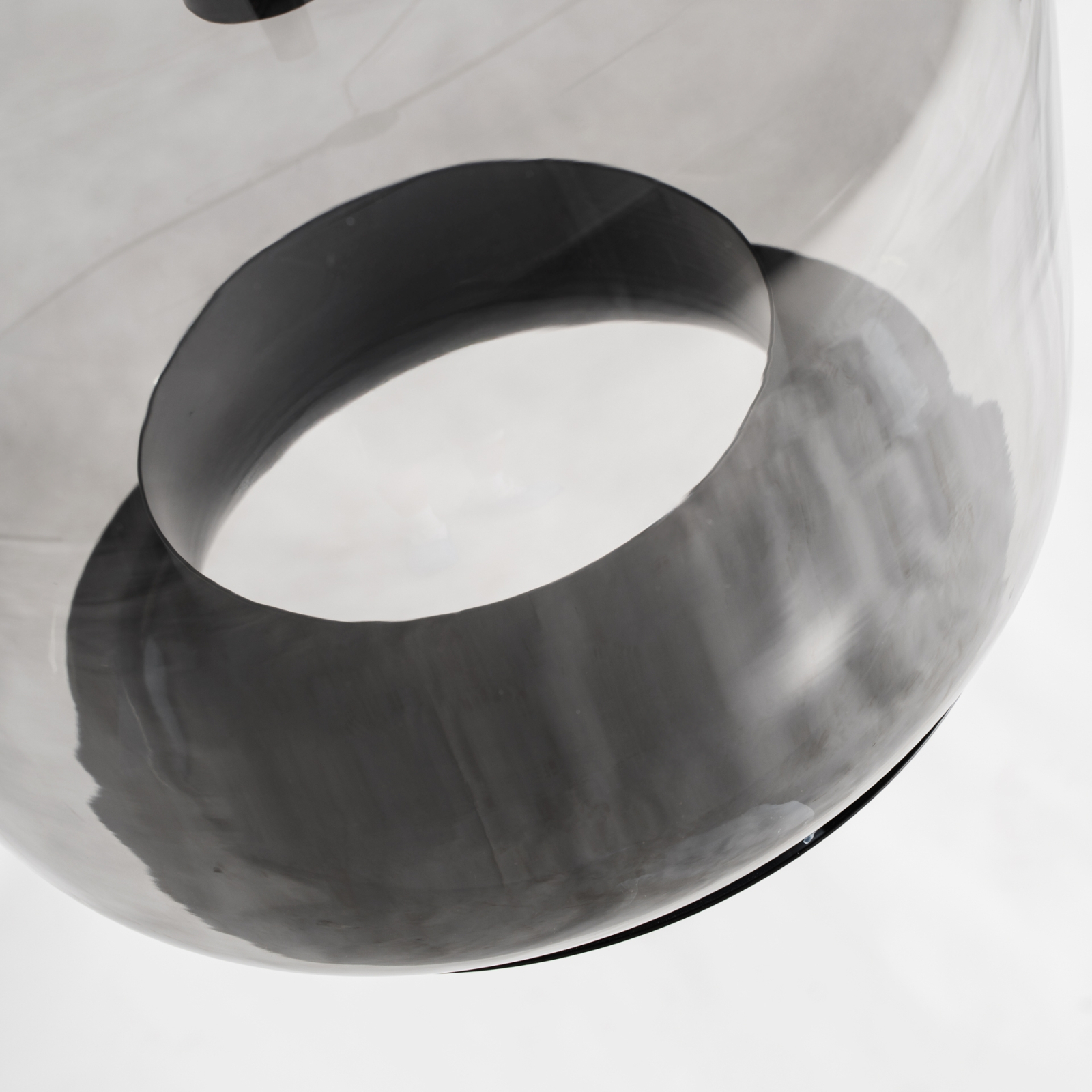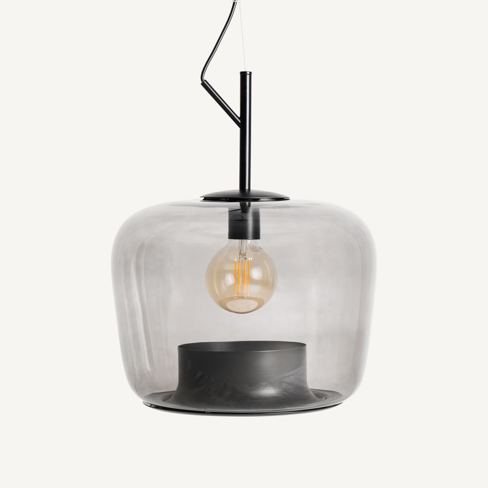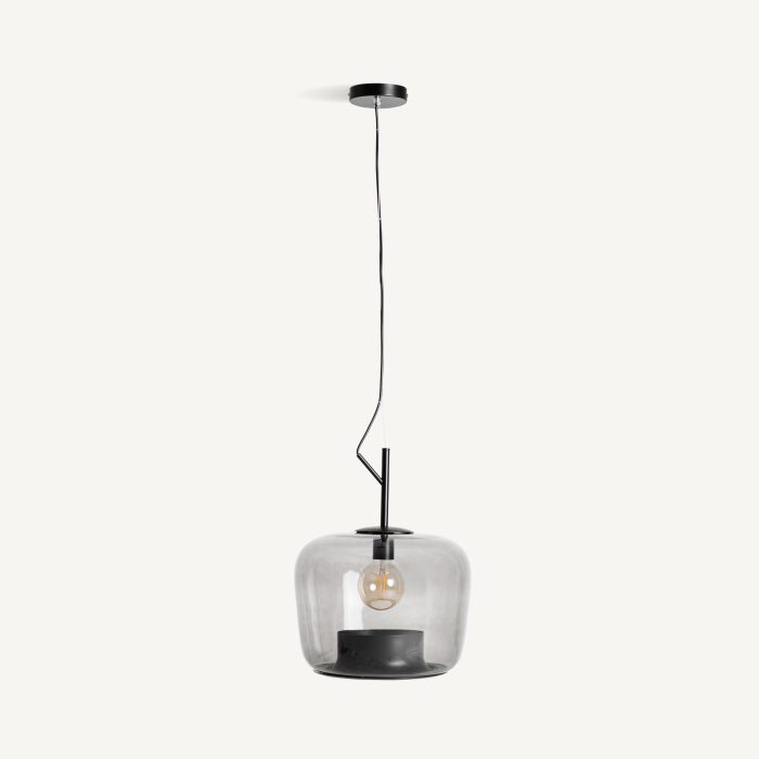 Abajurul este realizat din sticlă în culoare gri cu finisaj translucid, având o formă rotunjită care învăluie sursa de lumină și creează un efect vizual plăcut. Structura metalică în culoare neagră susține compoziția și adaugă un contrast discret, evidențiind liniile curate ale designului.