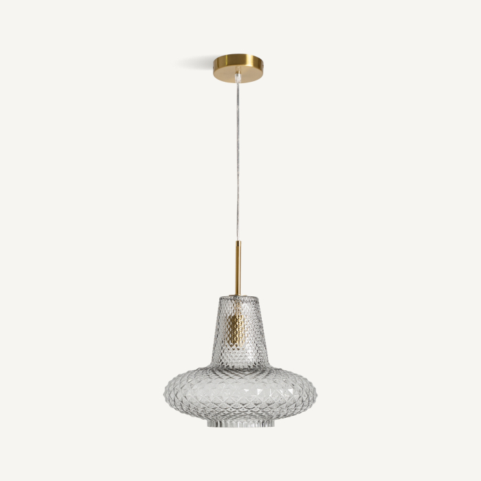 Această lampă suspendată aduce în prim plan un design decorativ cu influențe vintage, reinterpretat într o formă echilibrată și elegantă. Volumul său bine proporționat și textura bogată a sticlei creează un efect vizual cald, potrivit pentru interioare în care iluminatul are și rol estetic.