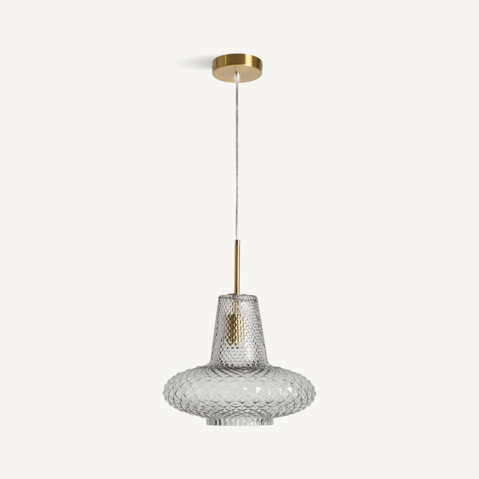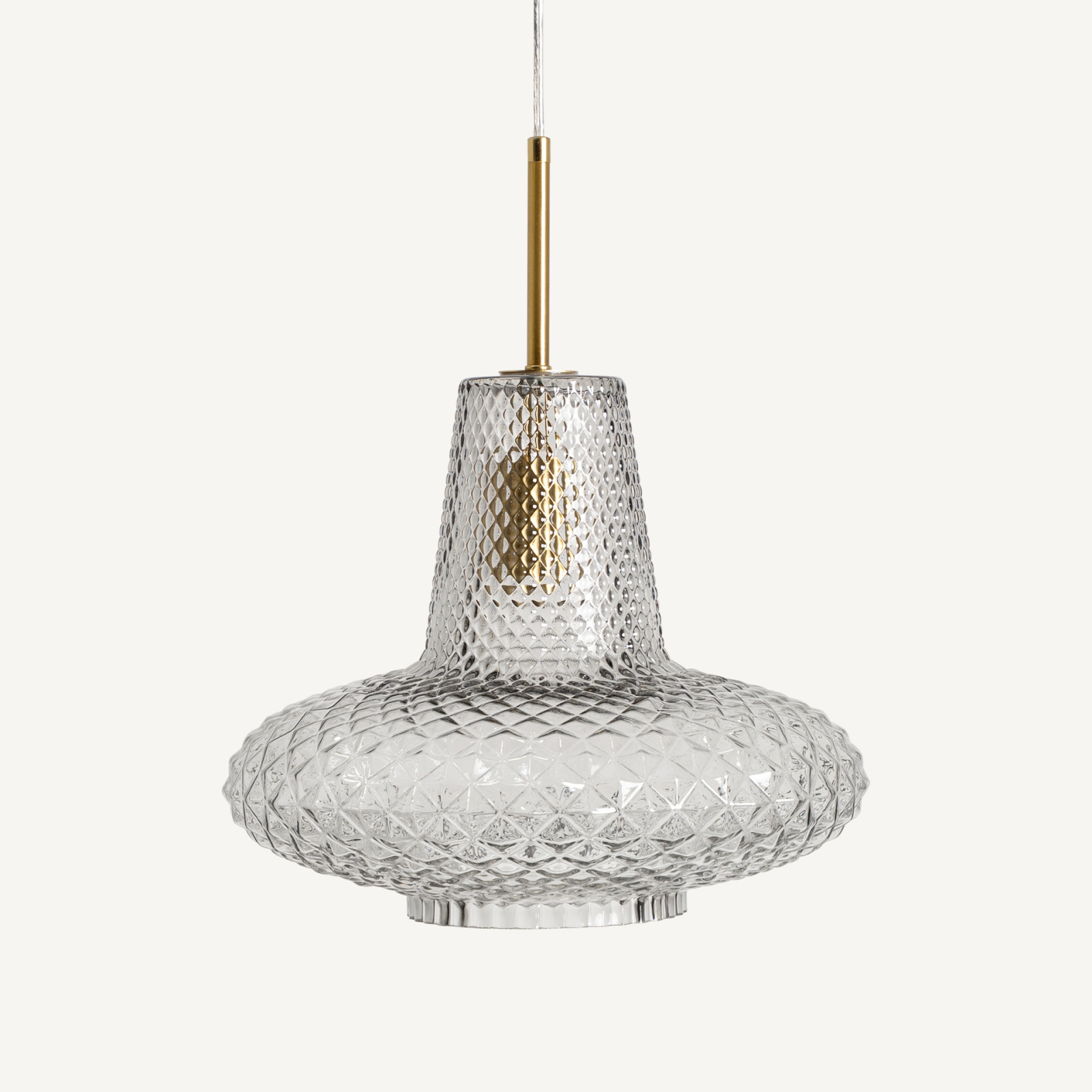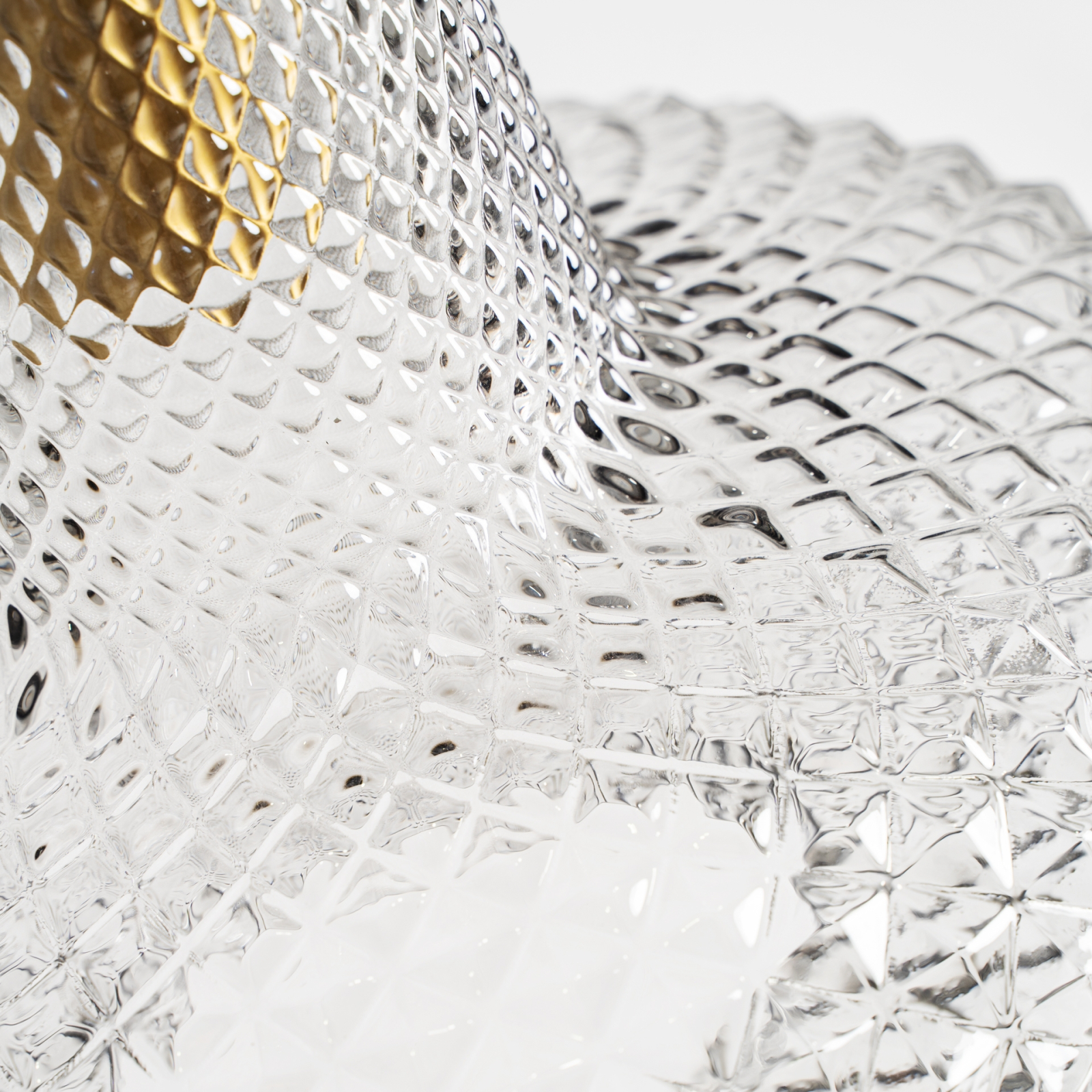 Abajurul este realizat din sticlă transparentă cu finisaj striat, care evidențiază jocul de reflexii și conferă profunzime piesei. Modelul geometric al sticlei accentuează forma rotunjită și permite difuzarea luminii într un mod plăcut și uniform.