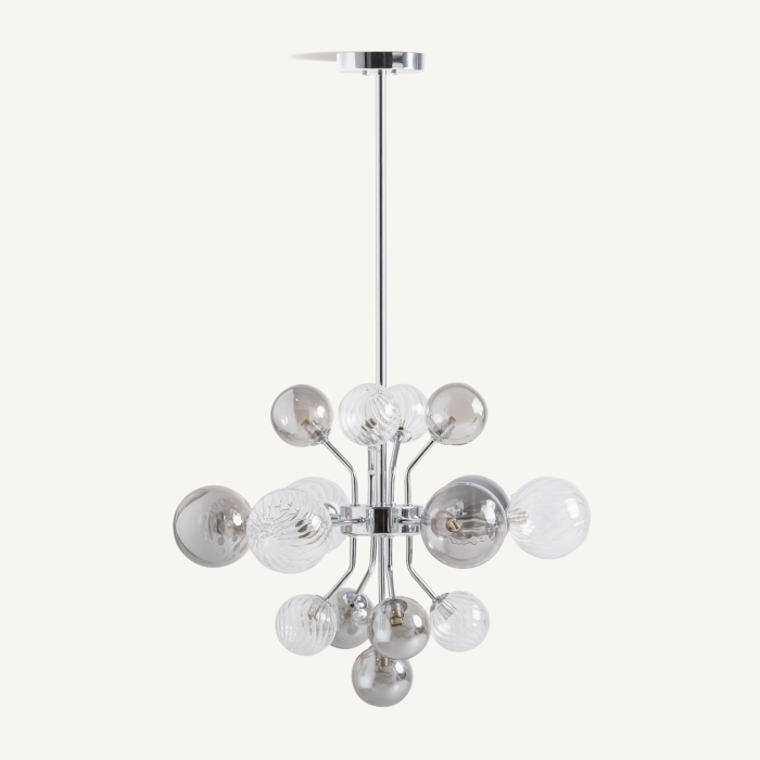 Structura metalică cu finisaj argintiu susține compoziția într-o formă aerisită, cu linii curate și proporții bine definite. Dispunerea globurilor în jurul axului central accentuează aspectul geometric și transformă lampa într-un element decorativ central pentru spații ample.