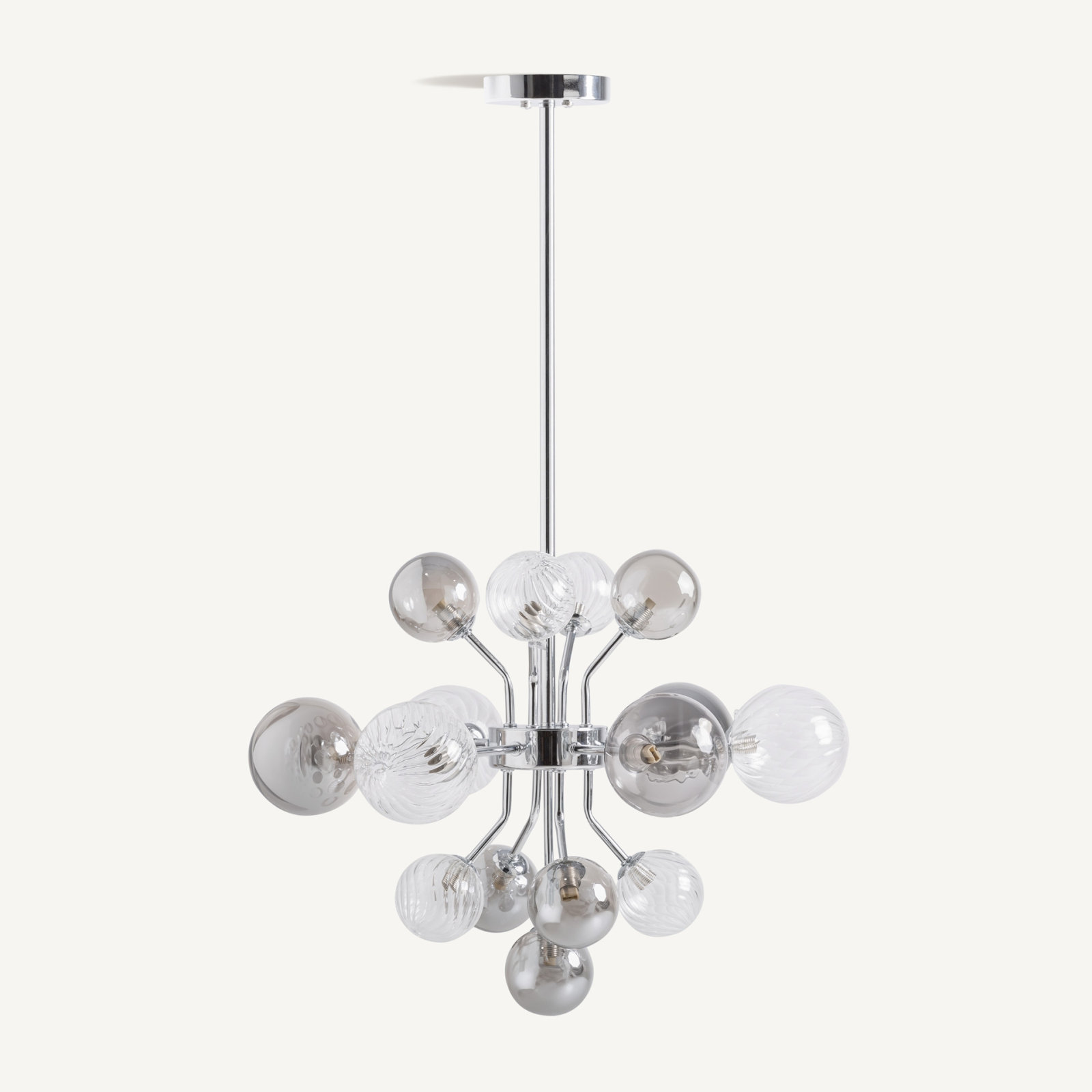 Lampă suspendată cu structură metalică cromată și globuri din cristal fumuriu Carla 60 x 60 x 133 cm