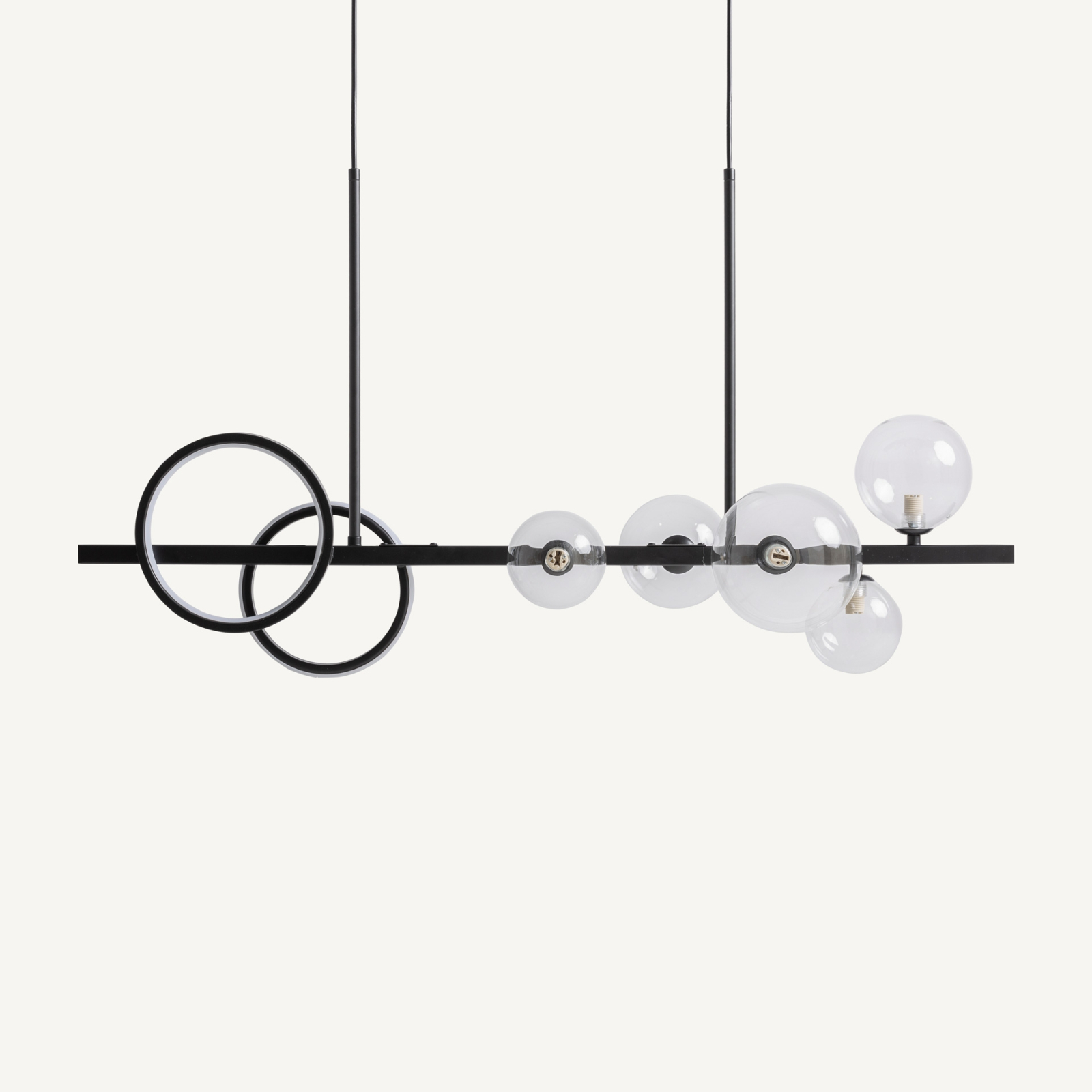 Structura din oțel negru, cu detalii circulare decorative, susține armonios ansamblul și evidențiază caracterul geometric al piesei. Aspectul aerisit și liniar face ca lampa să se integreze ușor în spații contemporane, zone de dining sau livinguri cu personalitate.