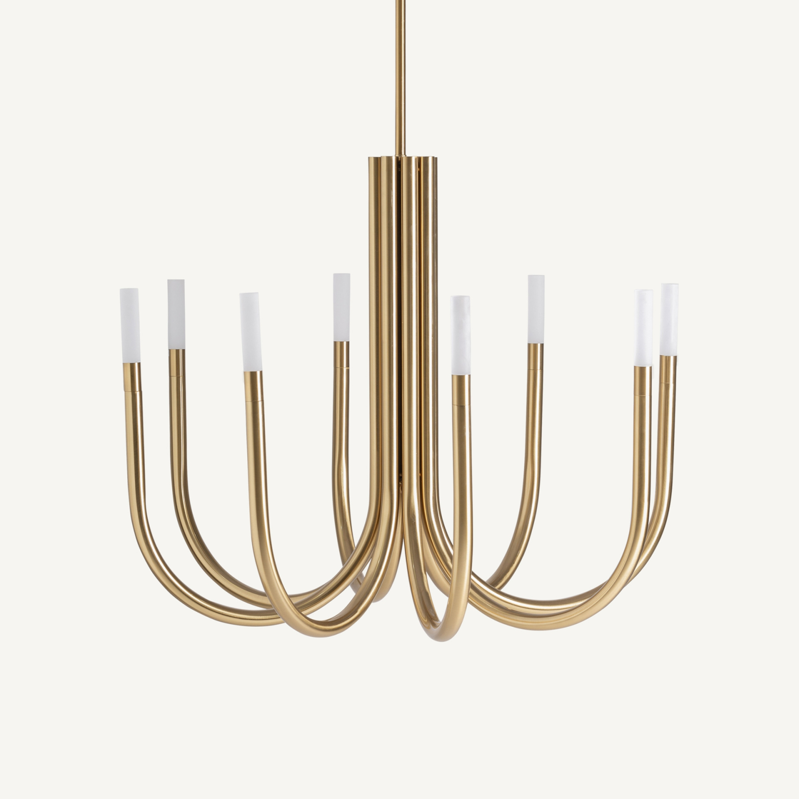 Structura lămpii este realizată din oțel cu finisaj auriu vechi, modelat în brațe alungite și curbate care coboară elegant din corpul central. Ritmul repetitiv al acestor elemente conferă dinamism vizual și subliniază caracterul decorativ al piesei.