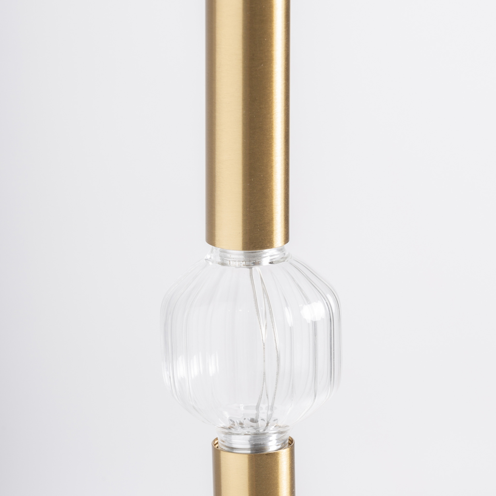 Compoziția liniară și transparența cristalului permit o difuzie delicată a luminii, generând un efect vizual subtil și sofisticat. Finisajul metalic auriu adaugă un contrast cald și elegant, fără a încărca vizual spațiul.