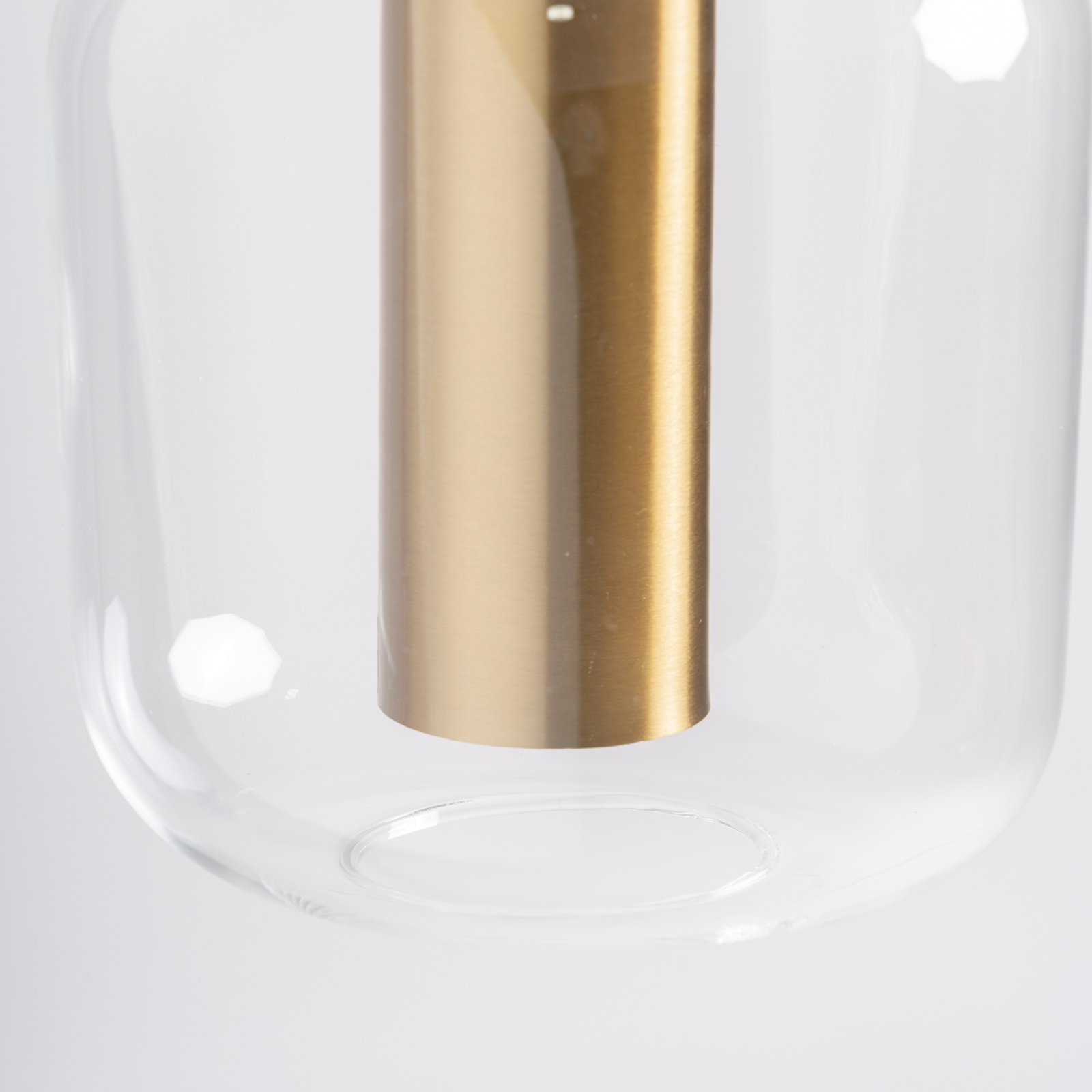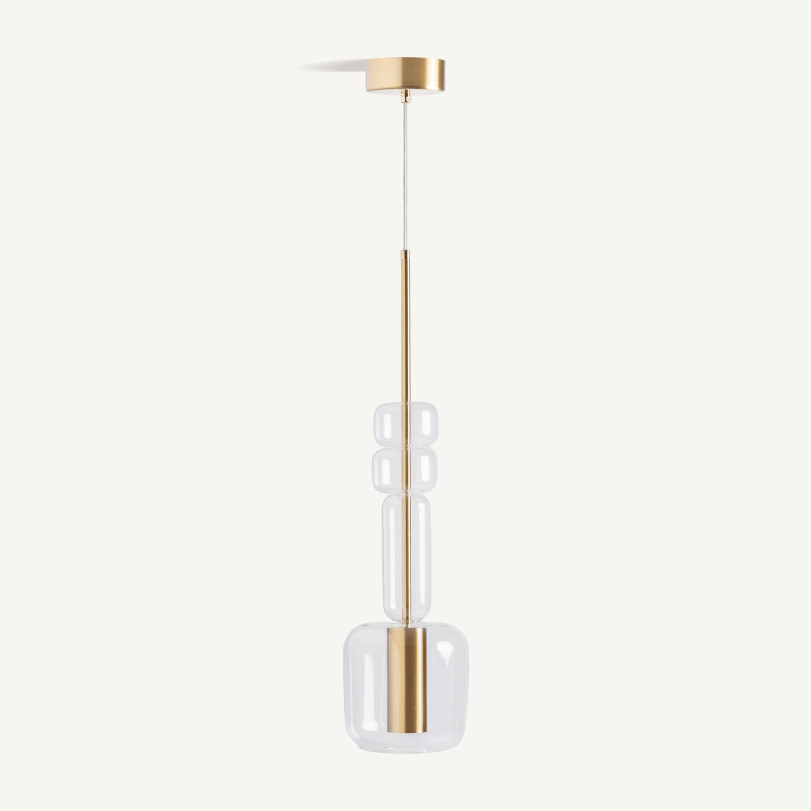 Această lampă suspendată se remarcă printr-o compoziție verticală elegantă, cu un joc echilibrat între modulele din cristal transparent și structura metalică cu finisaj auriu vechi. Designul său aerisit și proporțiile clare contribuie la amplificarea luminii și la crearea unei prezențe vizuale rafinate în spațiul interior.