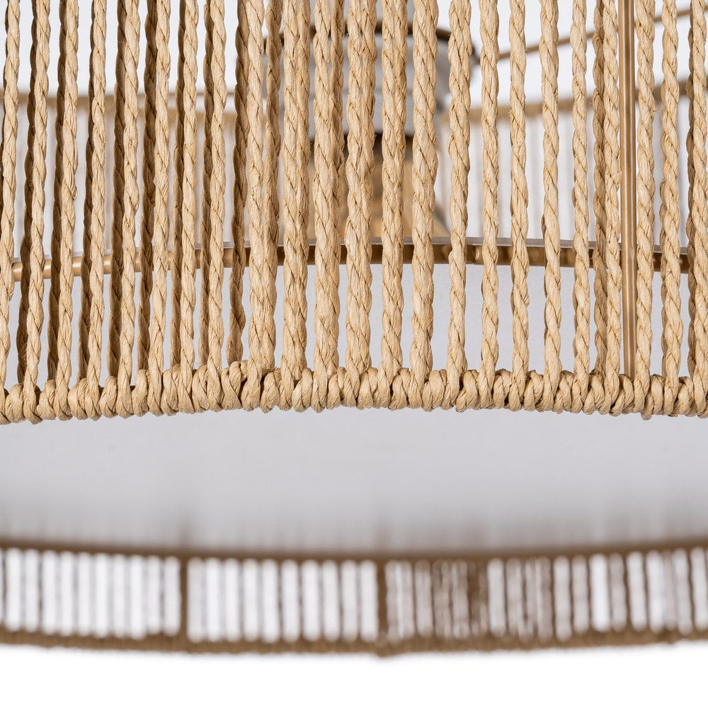 Împletitura verticală creează o textură caldă în jurul sursei de lumină, în timp ce difuzorul opal atenuează reflexiile și oferă o strălucire plăcută, continuă. Profilul plat, tip tambur, stă aproape de tavan și menține un aspect aerisit în încăperile cu înălțime standard.