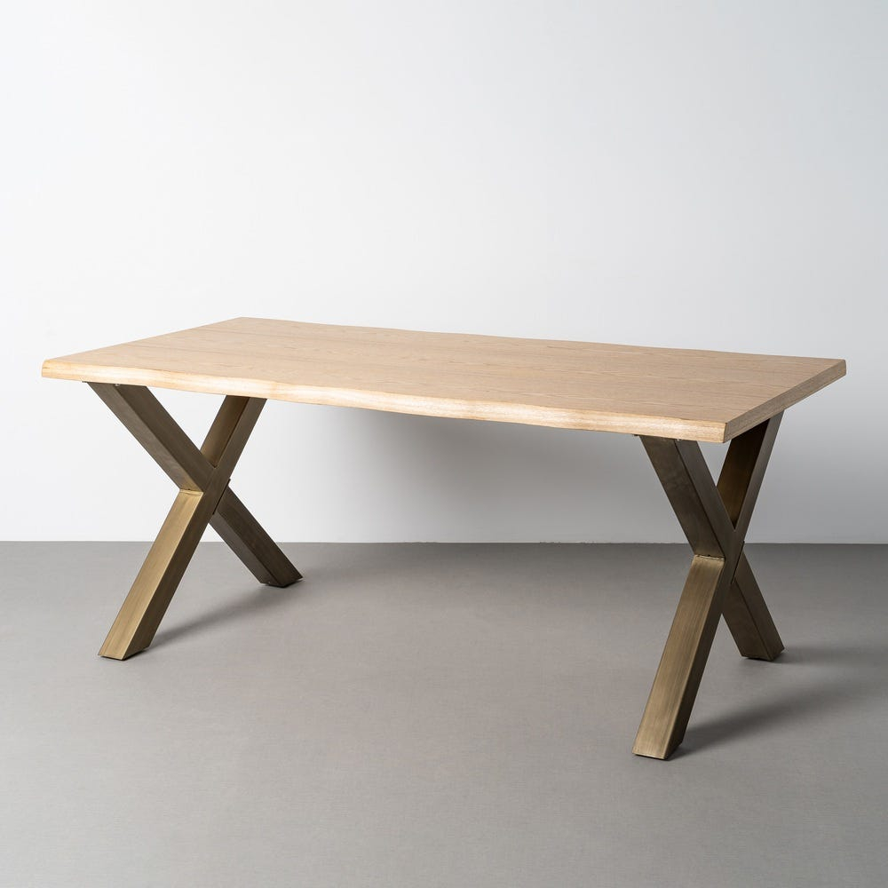 Picioarele metalice dispuse în formă de X susțin masa și creează un contrast plăcut cu suprafața blatului. Structura deschisă menține un aspect aerisit și permite integrarea ușoară a mesei în spații moderne sau cu influențe industriale.