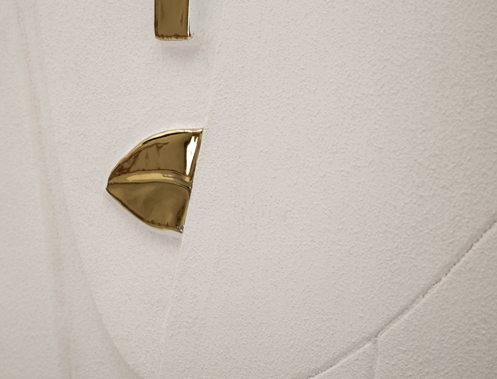Suprafața ceramică albă este modelată cu linii discrete care creează profunzime vizuală și pun în evidență elementele aurii aplicate. Acest contrast între textură și finisaj lucios oferă piesei un caracter decorativ distinct, transformând peretele într-un punct de interes vizual.