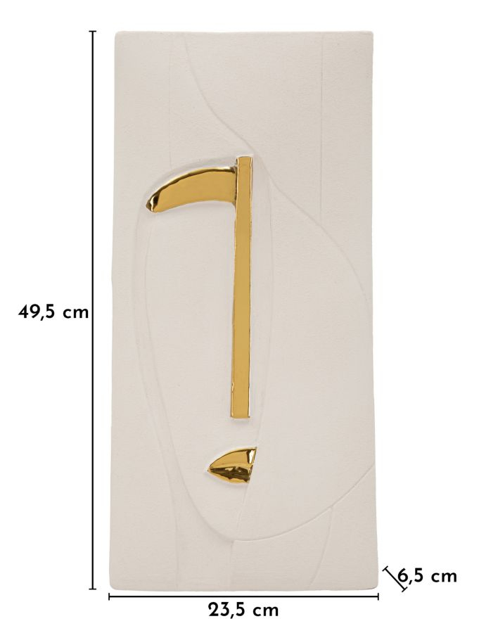 Acest decor de perete din ceramică aduce o prezență artistică și rafinată în amenajările interioare. Finisajul alb este pus în valoare de detaliile aurii lucioase care creează un contrast elegant și atrag subtil privirea. Forma verticală și liniile minimaliste transformă piesa într-un accent decorativ potrivit pentru livinguri sofisticate, holuri elegante sau spații HoReCa unde fiecare detaliu contribuie la atmosfera generală.