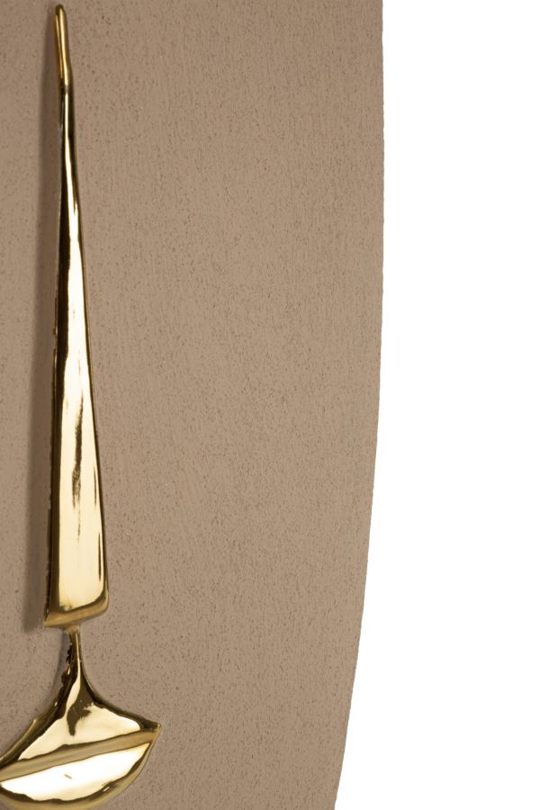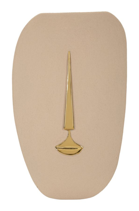 Această mască decorativă de perete din ceramică impresionează prin simplitatea formelor și eleganța detaliilor aurii. Nuanța maro cald oferă profunzime vizuală, iar elementul central auriu creează un contrast rafinat care atrage discret atenția. Designul inspirat din motive artistice stilizate transformă piesa într-un accent decorativ potrivit pentru livinguri sofisticate, holuri elegante sau spații HoReCa unde fiecare detaliu contribuie la atmosfera generală.