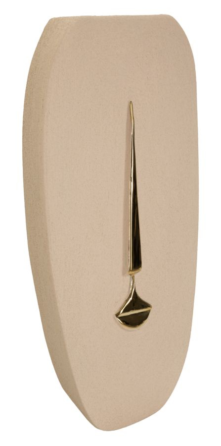 Suprafața ceramică are o textură discretă care pune în evidență forma curbată a piesei și linia aurie centrală. Acest detaliu lucios reflectă subtil lumina și adaugă o notă sofisticată întregii compoziții decorative.