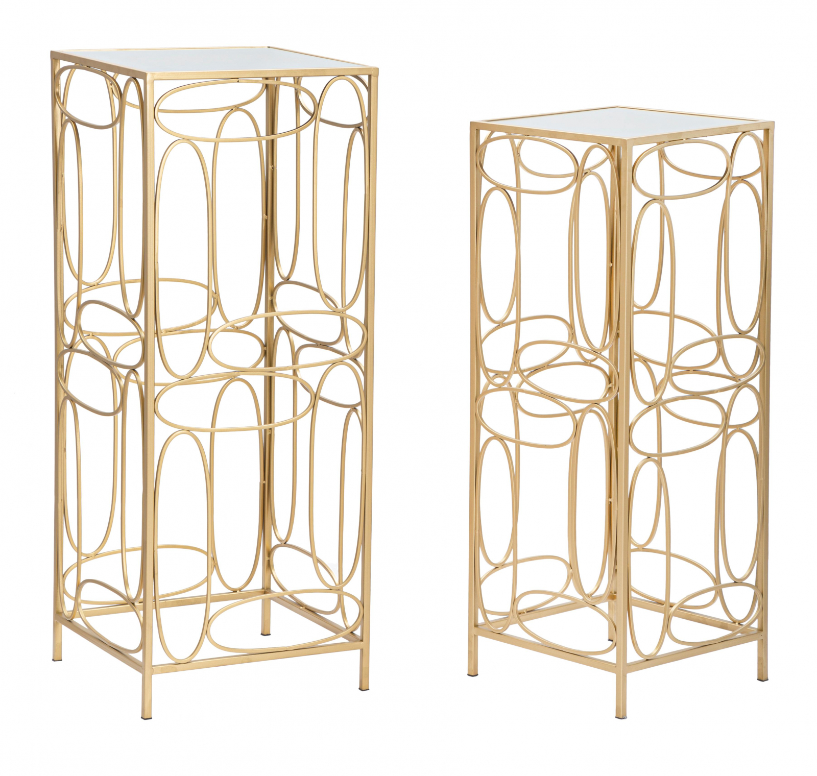 Pereche eleganta de masute patrate din metal auriu cu blaturi din oglinda.