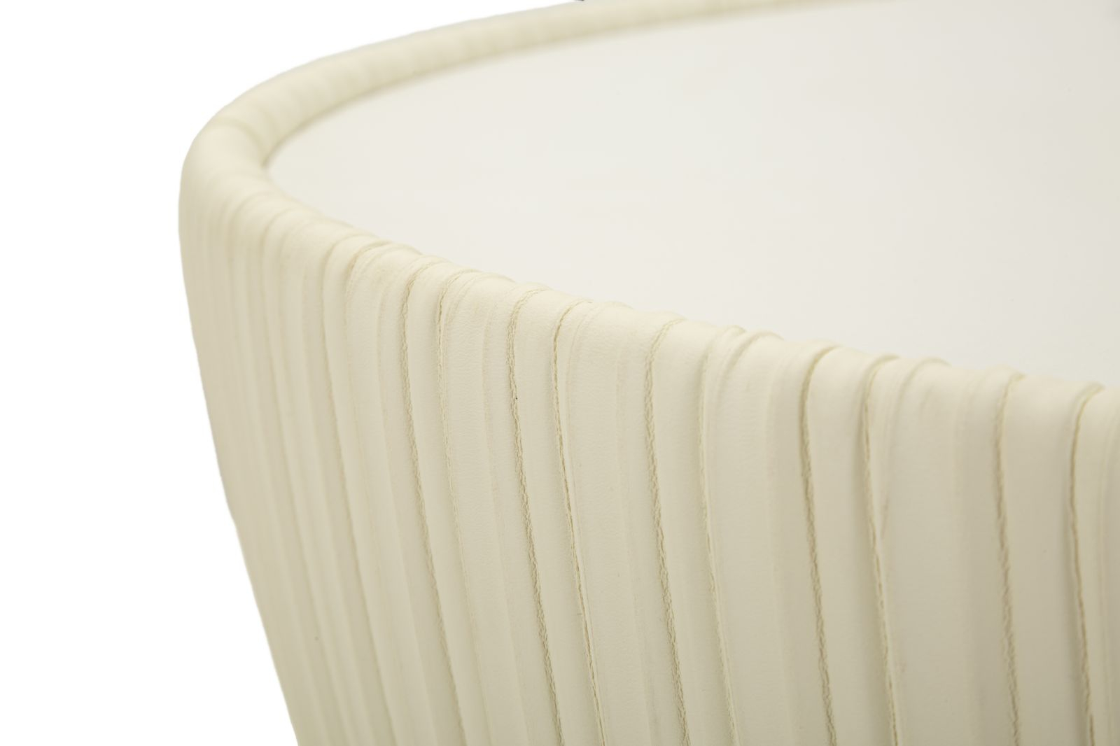 Corpul bol conturat de caneluri verticale filtrează lumina și pune în valoare nuanța crem mat, iar baza circulară cu aspect auriu ridică silueta și adaugă o notă glam discretă. Blatul neted rămâne practic pentru cărți, tăvi sau obiecte decorative, păstrând linia curată a piesei.