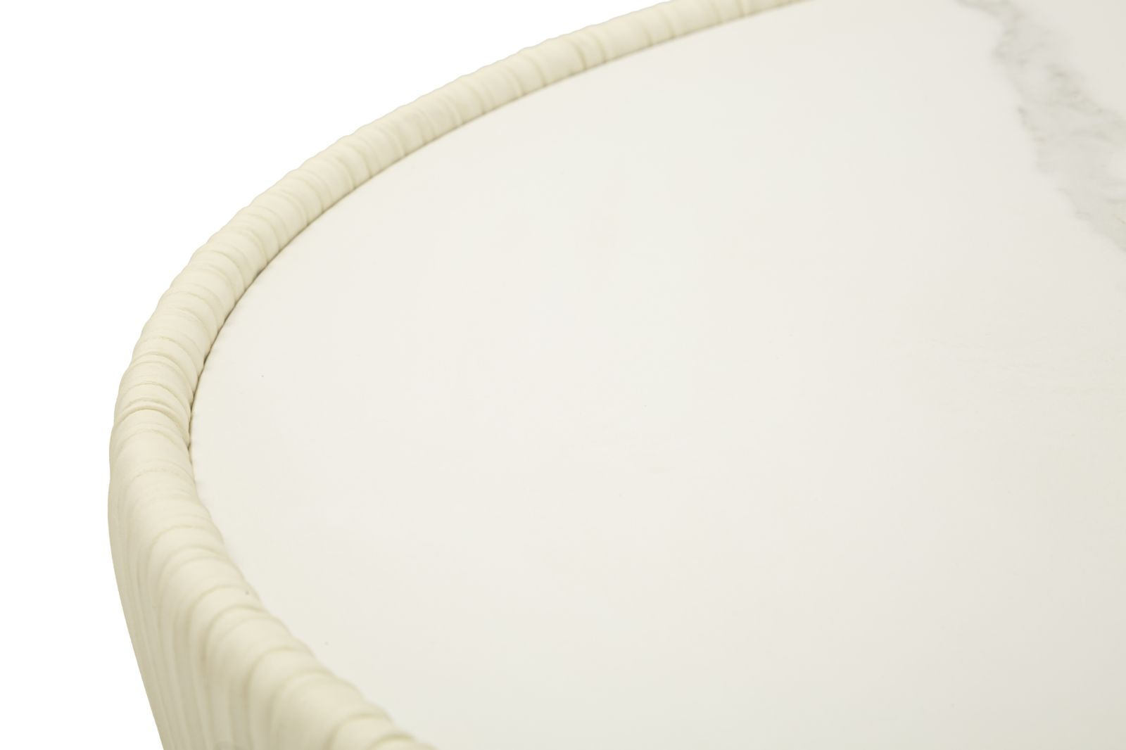 Masă de cafea din ceramică crem ELGE cu volum semisferic și textură canelată, gândită ca accent sculptural pentru living sau lounge, acolo unde formele curbe aduc calm și eleganță.