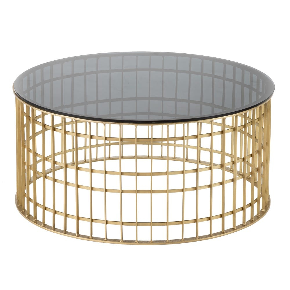 O piesă statement pentru un interior elegant, această masă de cafea impresionează prin structura sa geometrică din metal auriu și blatul rotund din sticlă cristalină în nuanță fumurie. Este o reinterpretare modernă a esteticii glam contemporane, cu influențe art deco discrete, ideală pentru spațiile sofisticate și feminine.