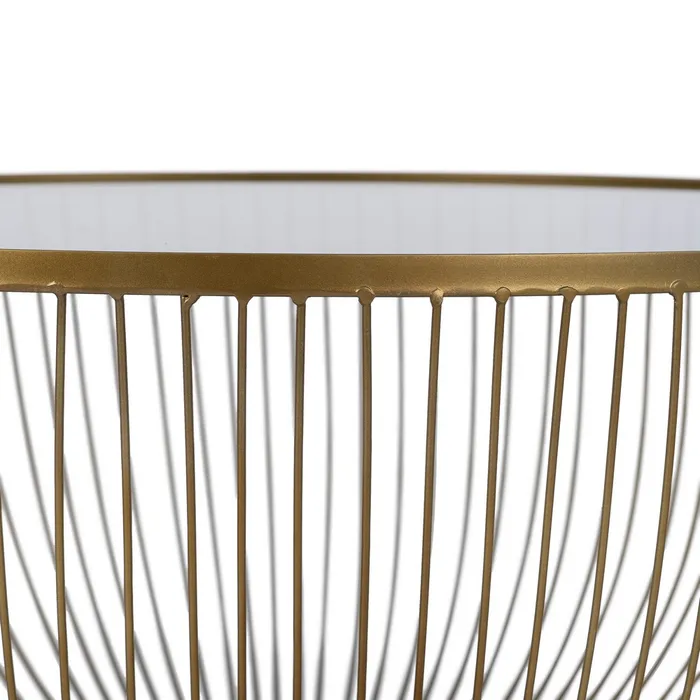 Aceasta masa de cafea eleganta din metal auriu si sticla transparenta impresioneaza printr-un design sculptural si o prezenta sofisticata, ideala pentru interioare cu influente glam sau Art Deco. Structura circulara din bare metalice fine, dispuse radial, creeaza un efect vizual aerisit si rafinat. Baza este accentuata cu un disc din marmura, care asigura stabilitate si echilibru, adaugand un detaliu de lux discret.