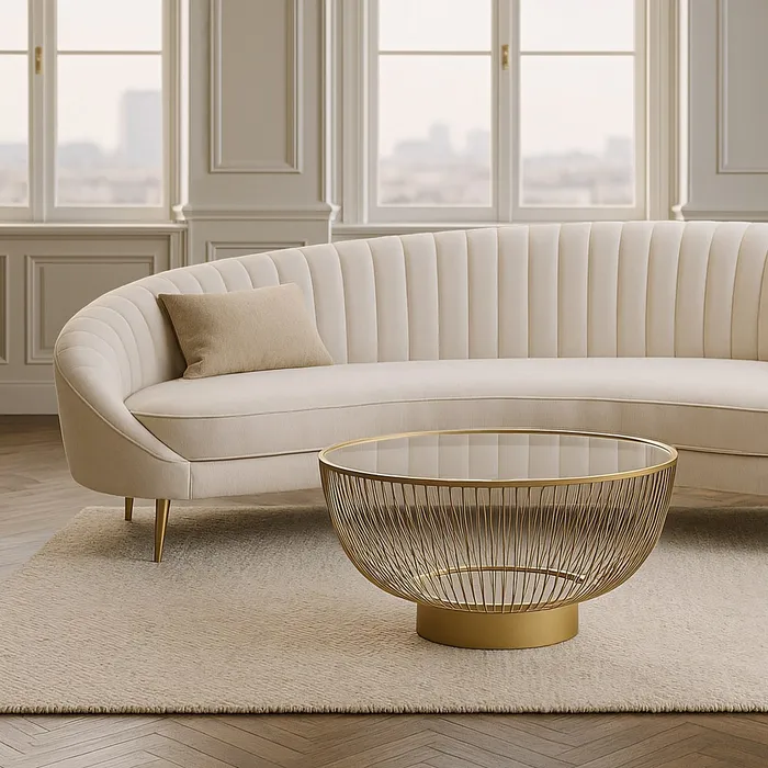 Blatul din sticla clara lasa lumina sa patrunda in interiorul structurii, punand in valoare jocul de linii si reflexii aurii. Acest contrast intre materialele transparente si solide transforma masa intr-un punct focal modern si expresiv. Designul grafic si in acelasi timp feminin se potriveste perfect in livinguri elegante, spatii de lounge sau colturi de relaxare unde se doreste un impact vizual de efect, dar fara incarcatura vizuala.