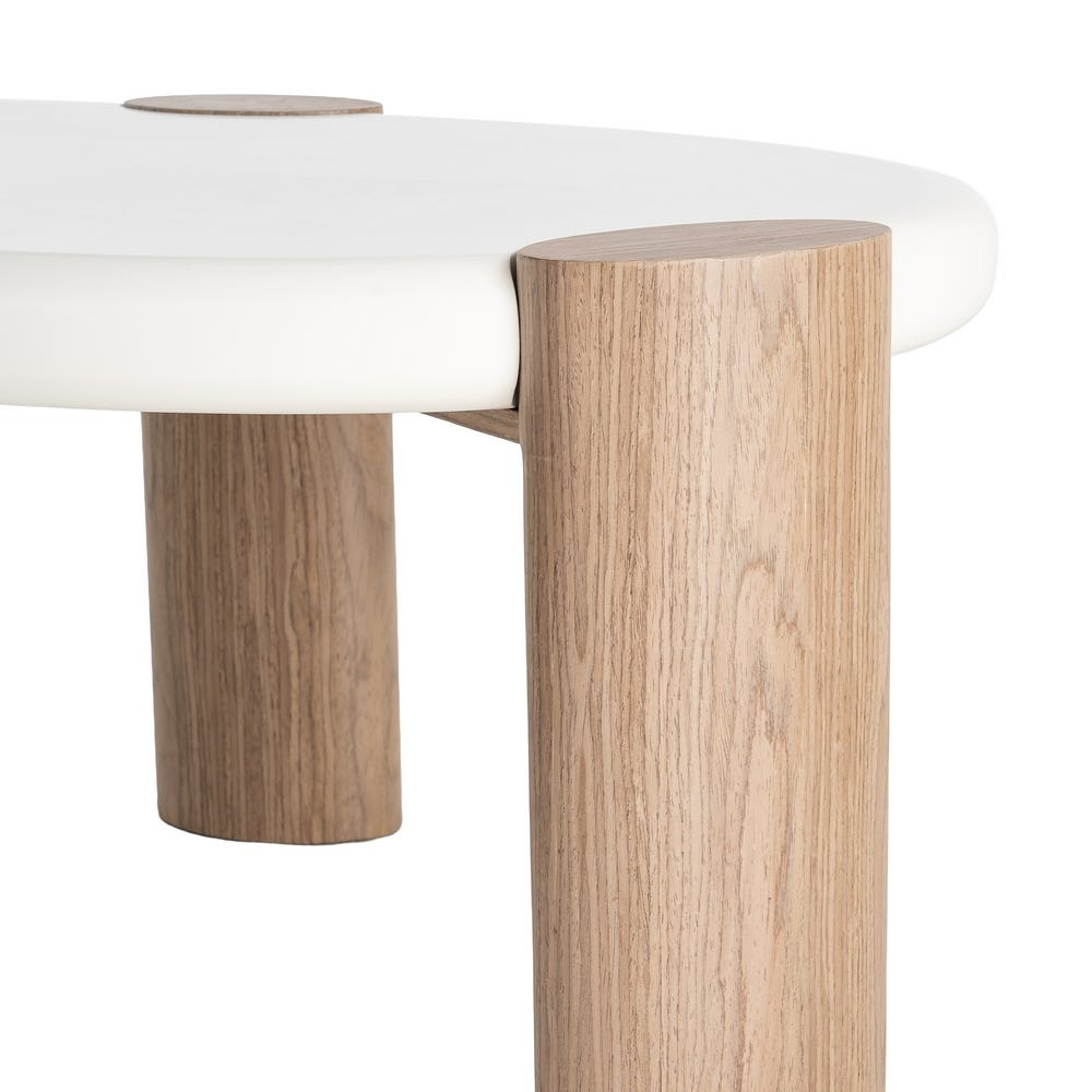 Picioarele cilindrice cu finisaj natural oferă stabilitate și creează un contrast cald față de albul blatului. Poziționarea acestora susține echilibrul vizual al mesei și întărește conceptul de piesă de design, potrivită pentru interioare moderne sau minimaliste cu accente naturale.