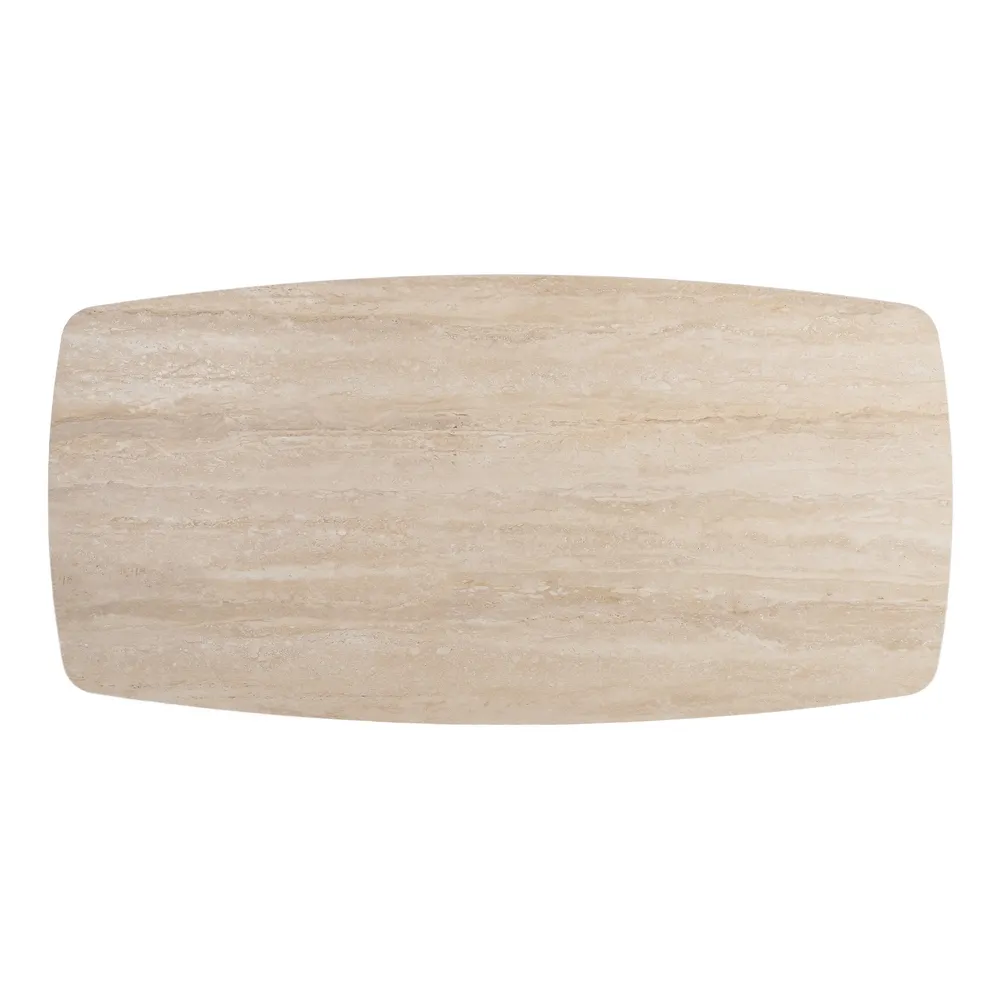 Nuanța deschisă a travertinului luminează încăperea și pune în valoare țesăturile și lemnul din jur, în timp ce profilul îngust al blatului păstrează senzația de lejeritate. Muchiile rotunjite atenuează geometria și fac masa prietenoasă la atingere, astfel încât obiectele se așază natural fără să aglomereze câmpul vizual.