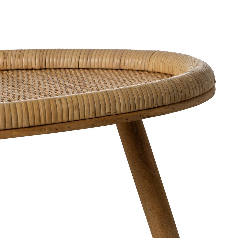 Blatul împletit fin și rama rotunjită evidențiază măiestria manuală a piesei. Această măsuță poate funcționa ca suport pentru cărți, tăvi decorative, lumânări parfumate sau plante în ghivece mici, integrându-se armonios în spațiile unde naturalețea și confortul sunt prioritare.