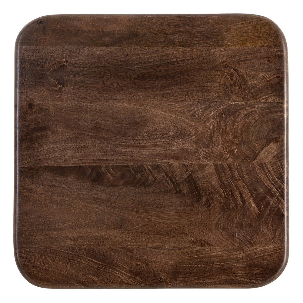 Blatul pătrat, cu muchii rotunjite, oferă o suprafață stabilă și plăcută vizual, păstrând o linie simplă și coerentă. Nuanța caldă a lemnului evidențiază desenul natural al fibrei, conferind mesei un aspect autentic și atemporal.