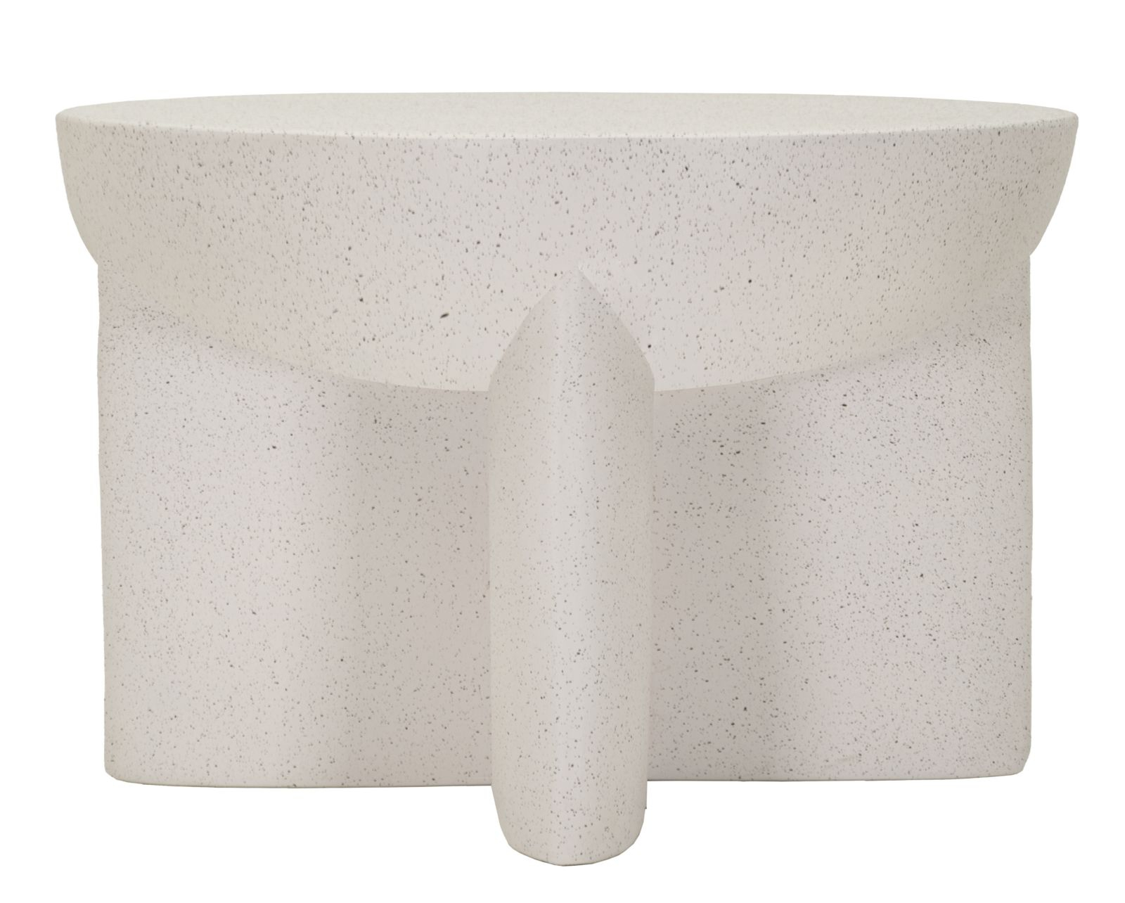 Forma rotundă și volumul compact transmit soliditate și stabilitate vizuală, în timp ce textura cu efect de piatră evidențiază caracterul material al suprafeței. Nuanța crem, presărată discret cu particule fine, oferă profunzime și o prezență sofisticată, ușor de integrat în interioare luminoase și aerisite.