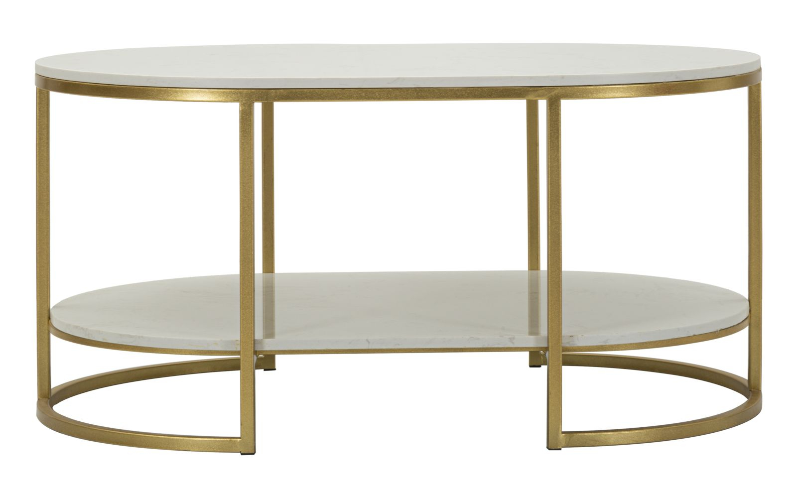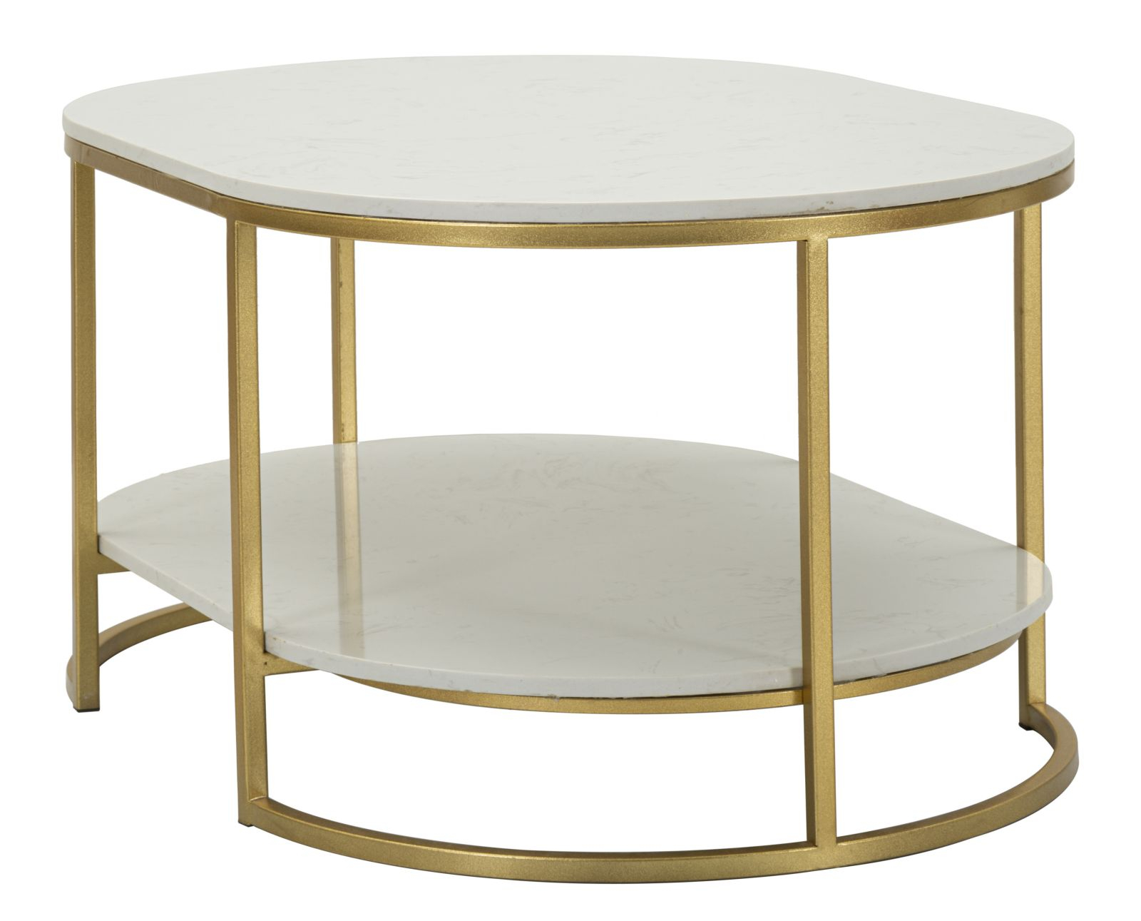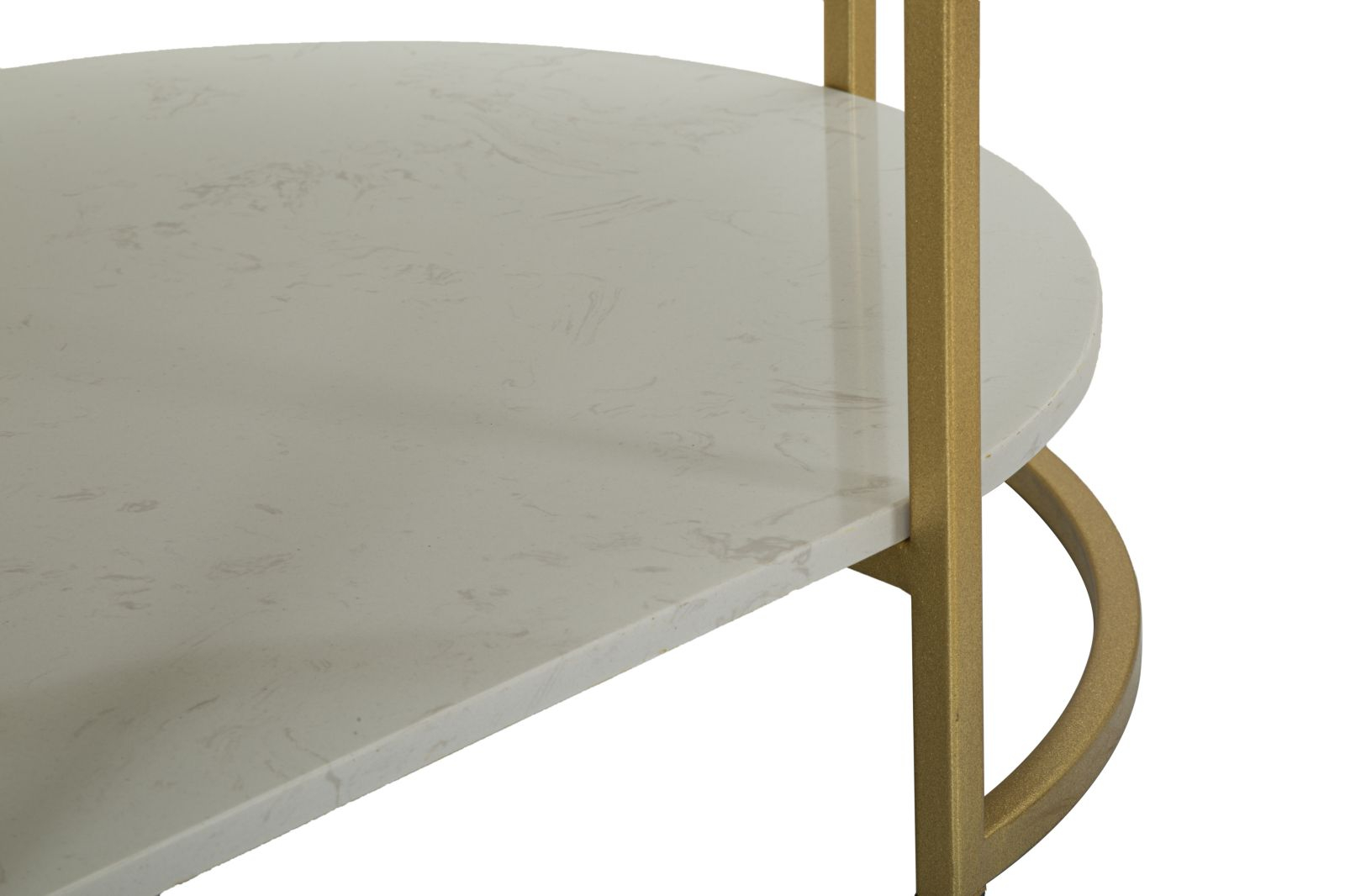 Structura sa metalica aurie, cu baza rotunda subtire si suporturi verticale fine, sustine armonios blaturile masive din marmura naturala cu finisaj lucios. Tonurile calde ale aurului si suprafata marmurata deschisa se completeaza pentru a crea o piesa centrala rafinata si sofisticata. Este ideala pentru livinguri elegante, amenajari glam, dar si ca piesa de accent intr-un hol spatios sau intr-un open space cu design premium.