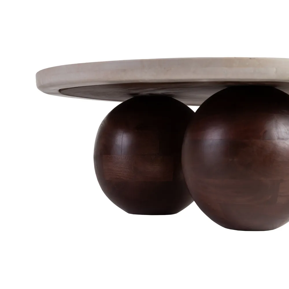Cele trei picioare sferice, lucrate din lemn masiv de mango, adaugă volum, echilibru și o notă artistică întregii compoziții. Acest joc între rotunjimea lemnului și suprafața netedă a marmurei creează un contrast plin de armonie – perfect pentru interioare moderne, organice sau cu accente art deco reinterpretate.