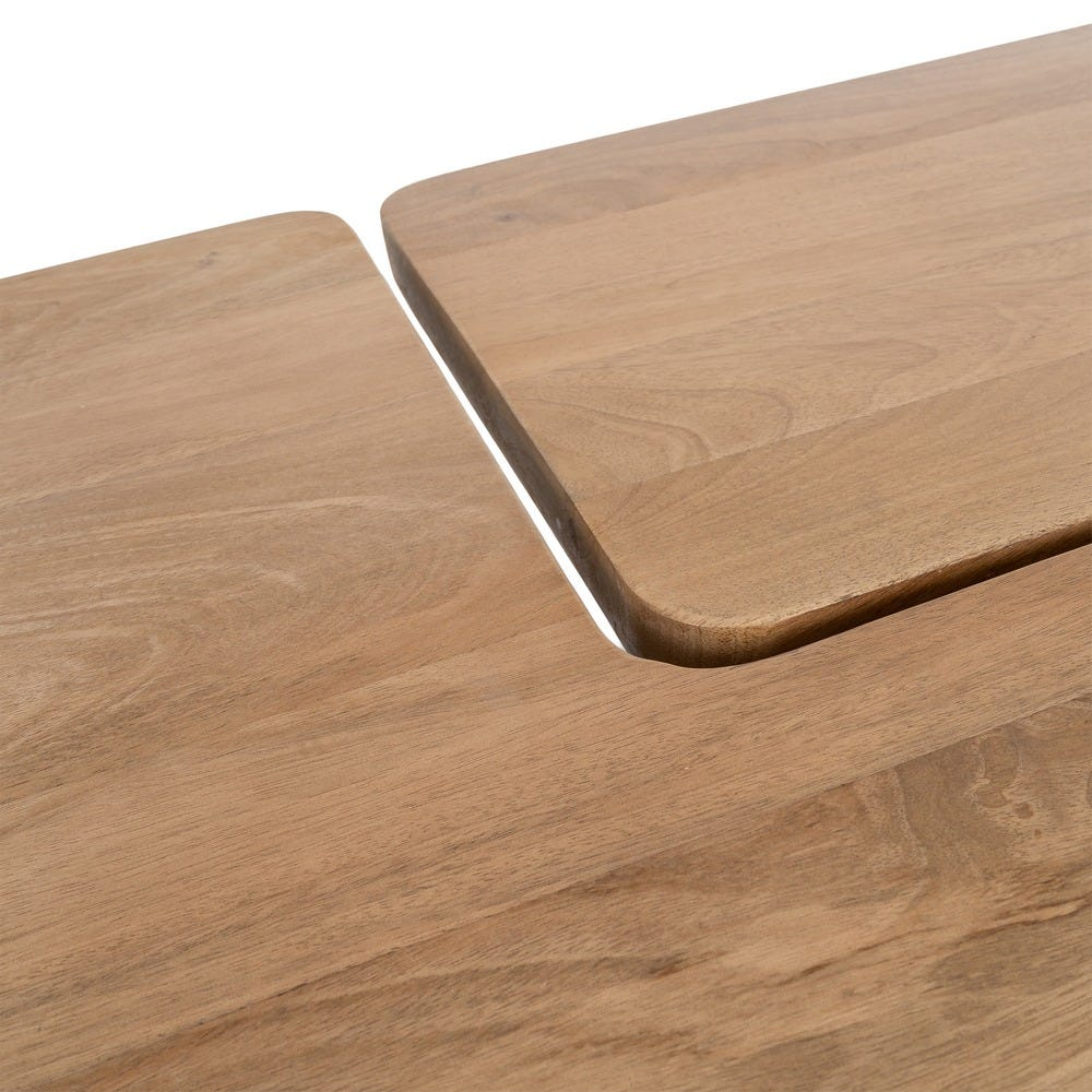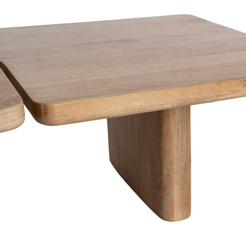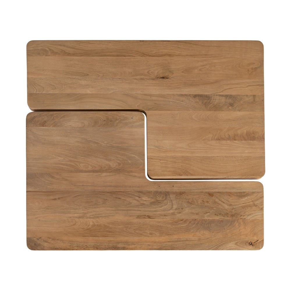 Mesele sunt realizate integral din lemn de mango, cu blaturi rectangulare joase și colțuri ușor rotunjite, susținute de baze solide cu volum plin. Diferența de poziționare și înălțime permite suprapunerea parțială sau alăturarea lor într-o compoziție coerentă și echilibrată vizual.