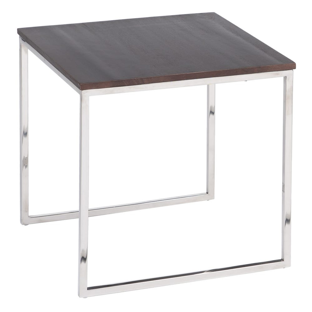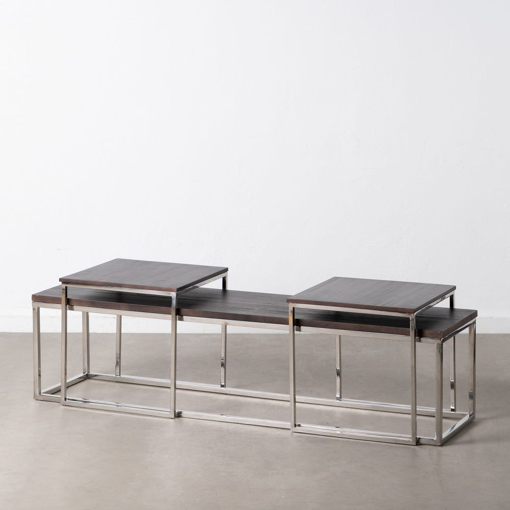 Set masa principala si 2 mese laterale lemn mango masiv maro inchis si otel inoxidabil lucios stil modern 152x38 5x38 5 si 45x45x46 cm