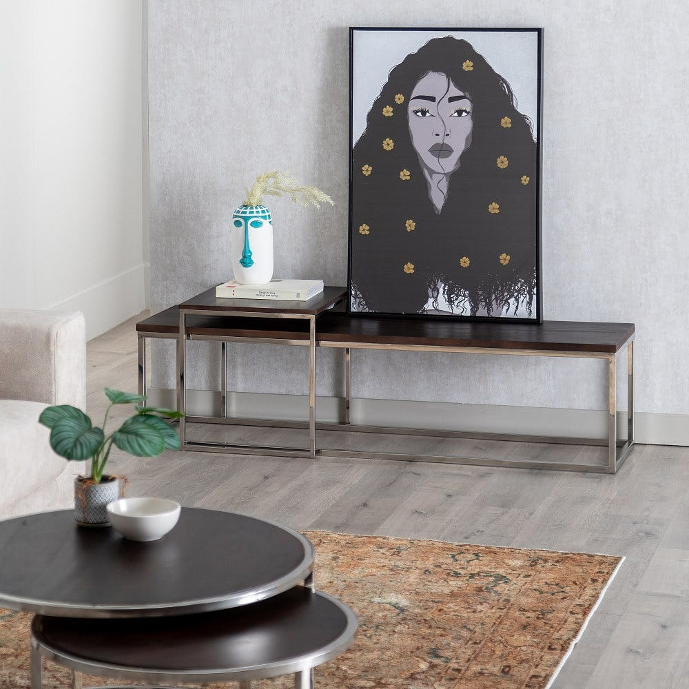 Elegant, modular și cu impact vizual sofisticat – acest set format dintr-o masă principală și două mese laterale este creat pentru spații moderne care valorizează estetica și funcționalitatea. Lemnul masiv de mango, în nuanță închisă, oferă un contrast rafinat față de structura metalică argintie, realizată din oțel inoxidabil lucios.