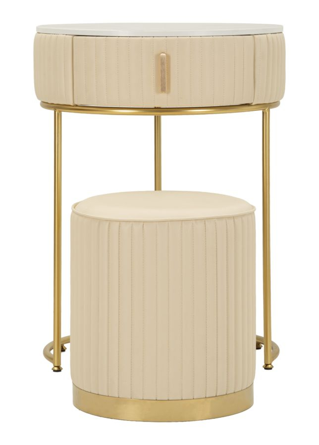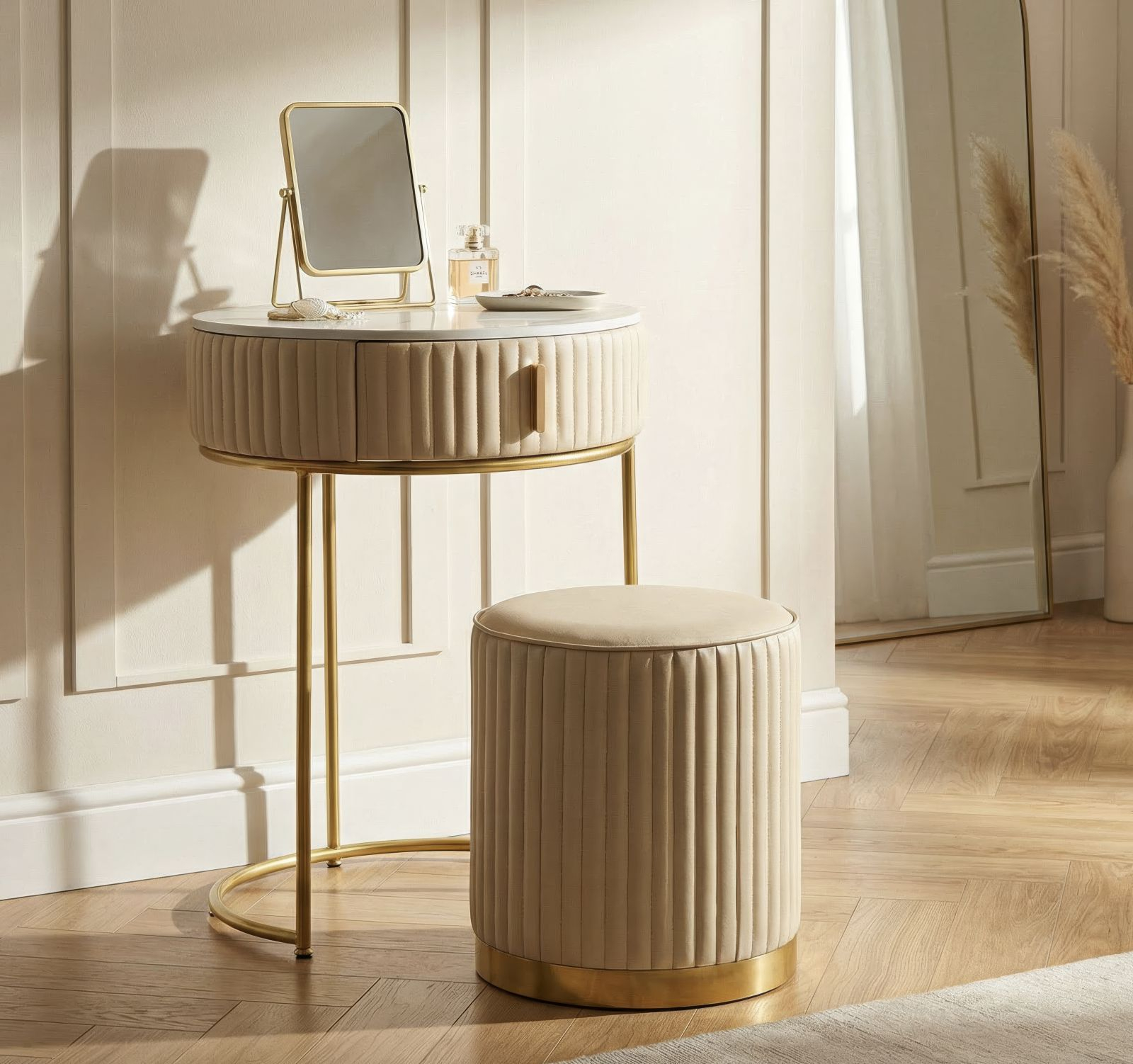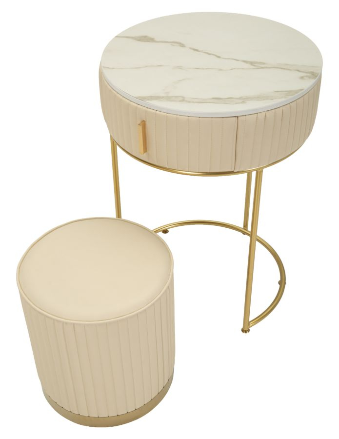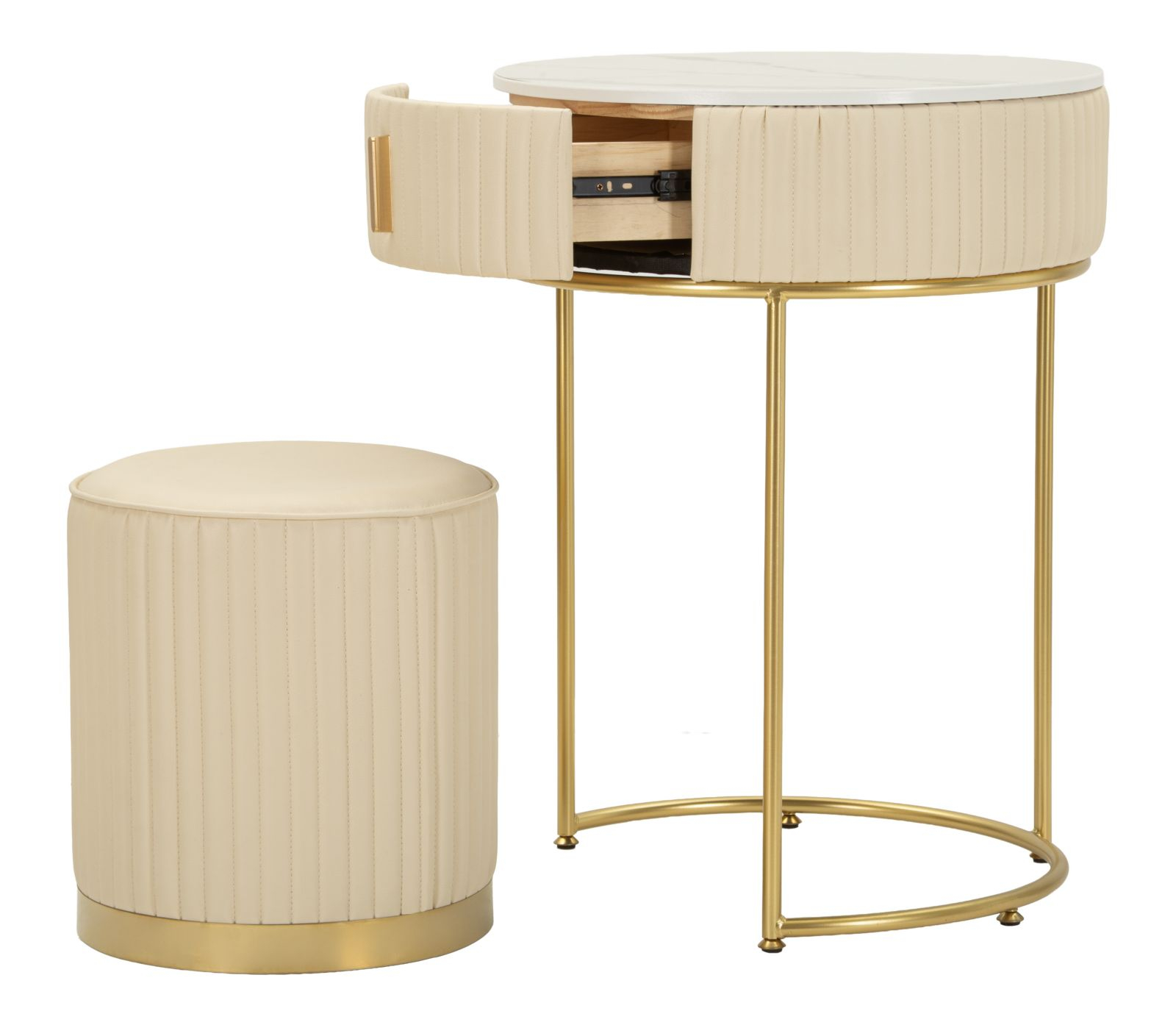 Taburetul rotund inclus completează ansamblul, oferind confort și armonie vizuală. Baza metalică aurie susține elegant măsuța și creează un contrast plăcut cu nuanța deschisă a tapițeriei, fiind potrivită pentru dormitoare elegante sau spații moderne de dressing.