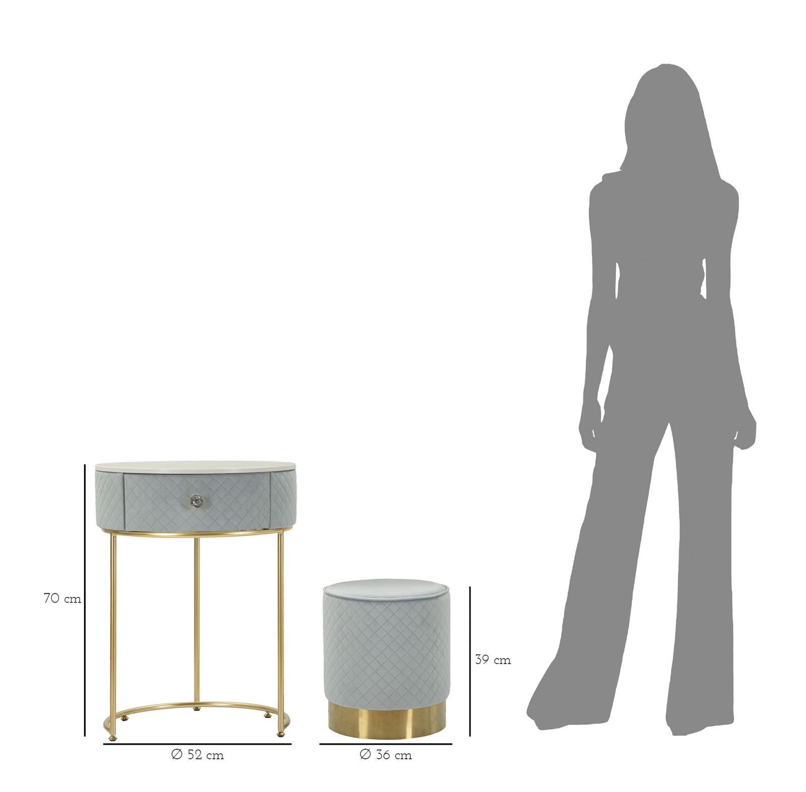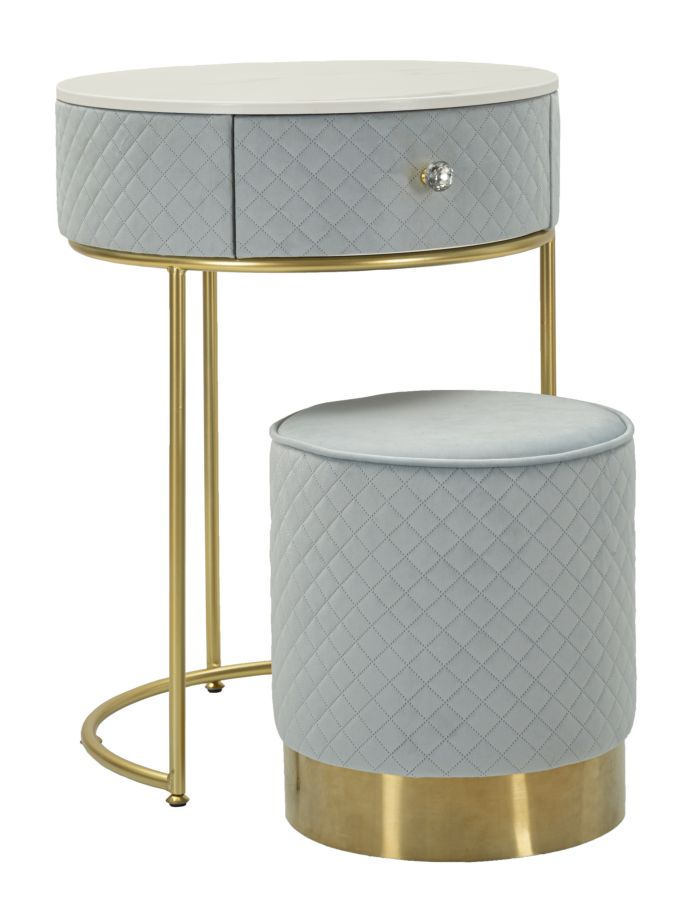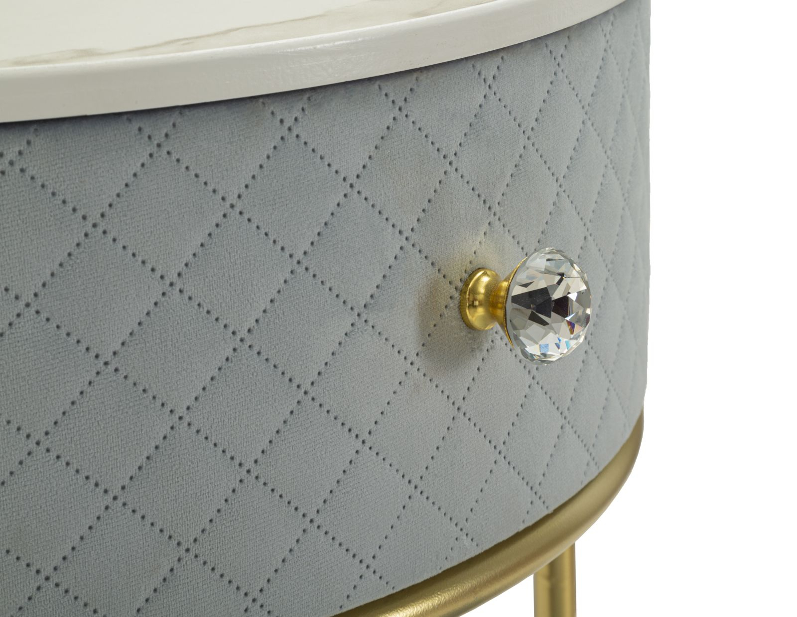 Structura subțire cu finisaj auriu susține blatul rotund, iar sertarul frontal este evidențiat de un buton decorativ cu aspect de cristal. Puful cilindric repetă textura cu carouri fine și se termină într-o bază metalică care leagă vizual ansamblul.