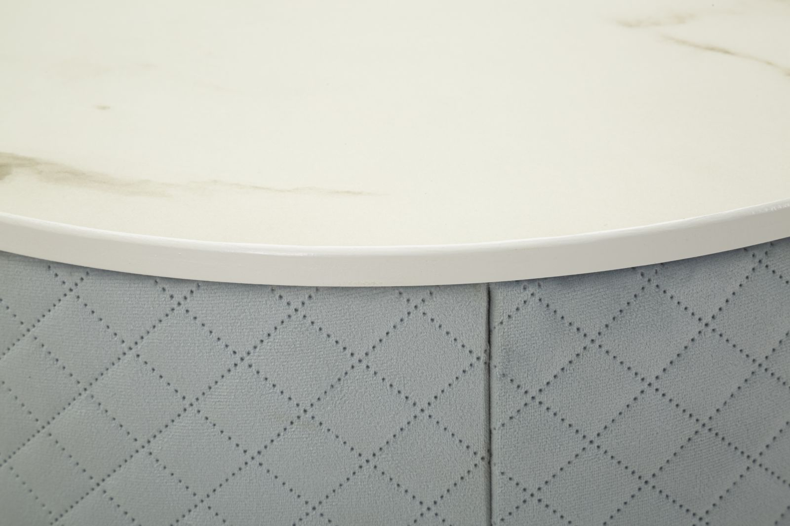 Măsuță de toaletă cu puf din țesătură albastru deschis pentru dormitor sau dressing, cu volum matlasat fin și accente aurii ce aduc un aer glam contemporan.