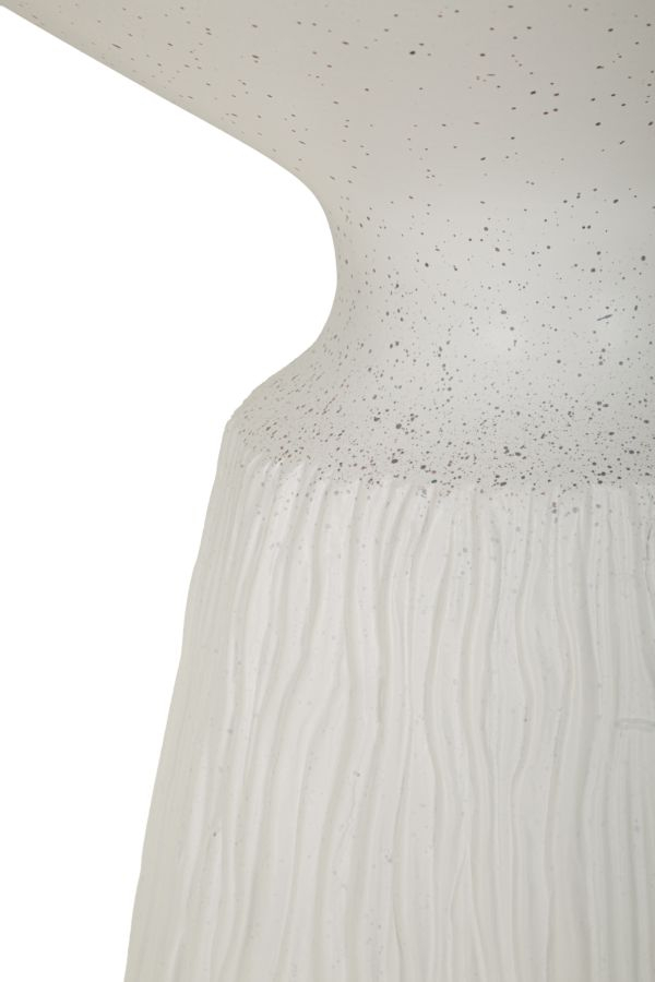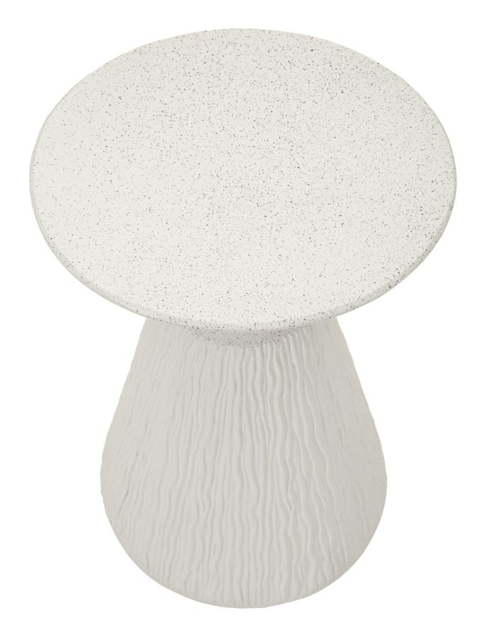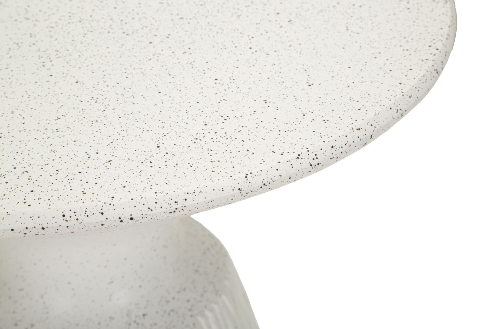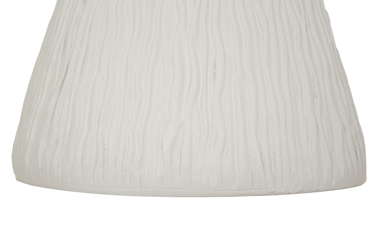 Blatul rotund, ușor evazat, se sprijină pe o bază conică texturată care adaugă profunzime vizuală și dinamism. Contrastul subtil dintre partea superioară netedă și suprafața inferioară cu relief vertical evidențiază caracterul sculptural al piesei, oferindu-i o identitate distinctă în spații moderne.