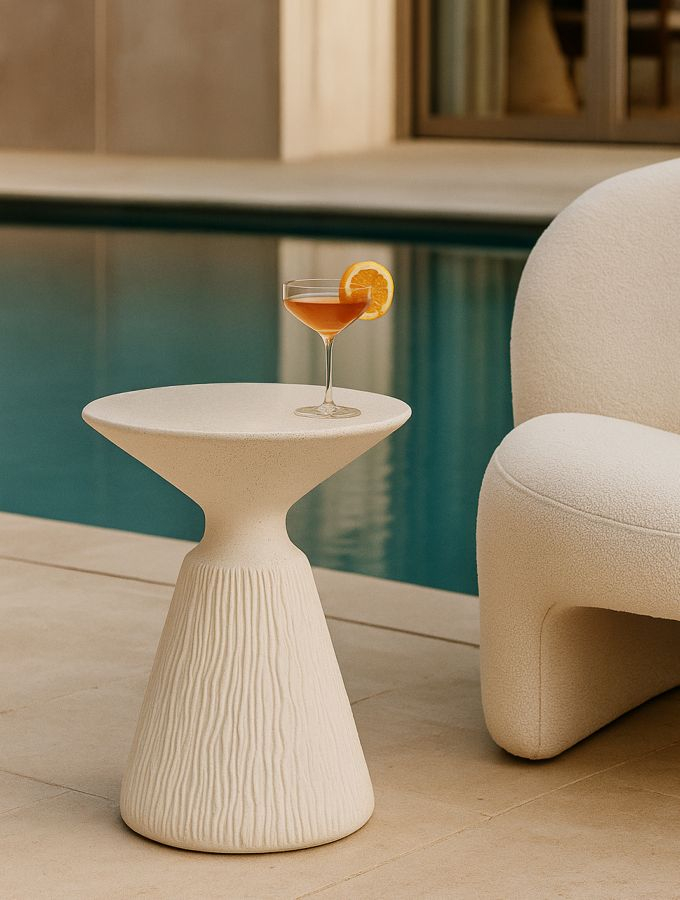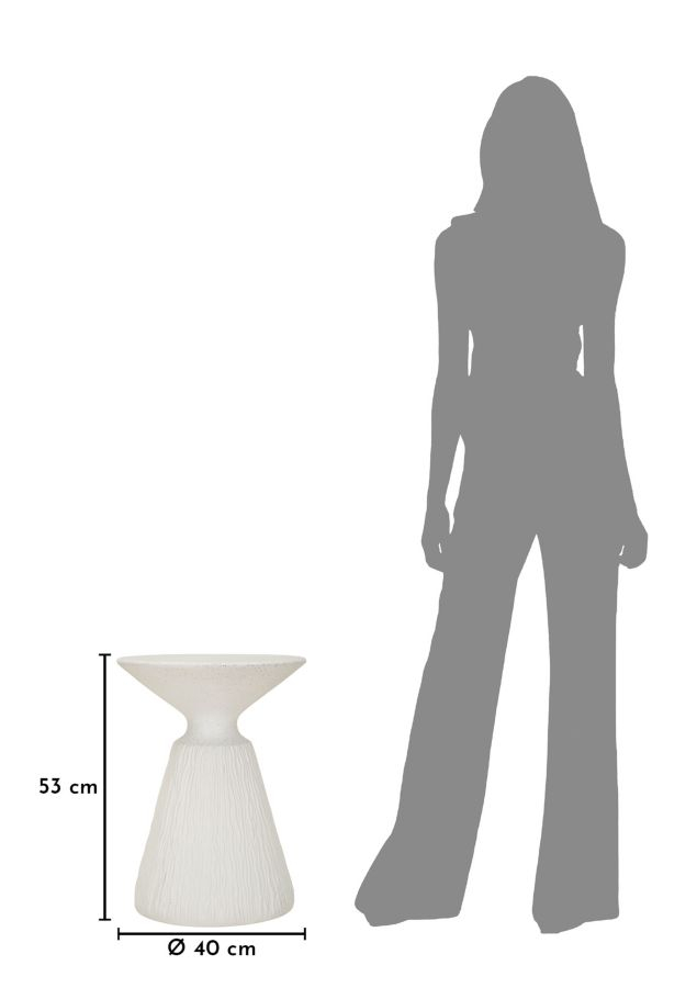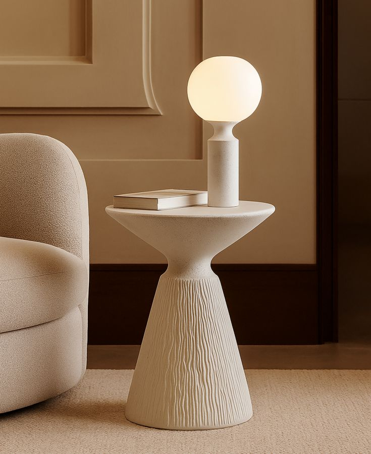 Sculpturală și modernă, cu un profil conic care captează lumina, această măsuță laterală devine o prezență discretă dar memorabilă în amenajare. Forma sa echilibrată și finisajul crem pun în valoare un design contemporan în care armonia dintre estetic și funcțional este exprimată prin volum și proporție.